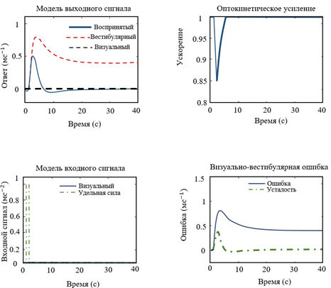 Динамический отклик двух моделей восприятия показан на рис. 2 и 3. Эти результаты моделирования демонстрируют способность модели отражать тот факт, что, в то время как вестибулярные чувства имеют временные (переходные) характеристики, индуцированное (искусственные) движение через зрительный канал по-прежнему доминирует в восприятии движения человеком.
