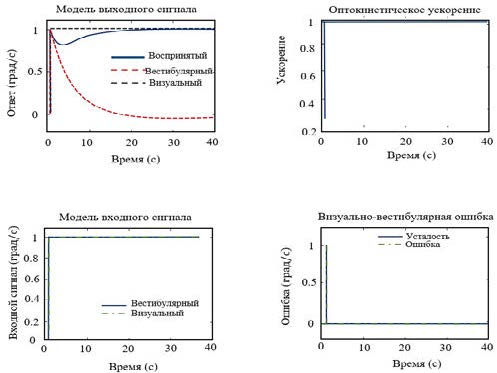 На рис. 3 представлена реакция модели восприятия вращения на визуальный и вестибулярный ступенчатый сигнал 1°/с. Реакция показывает резкий и точный зрительный ответ, и затухающий вестибулярный ответ. Поскольку оба органа чувств получают одинаковую информацию, угловая скорость в стабильном состоянии улавливается точно.