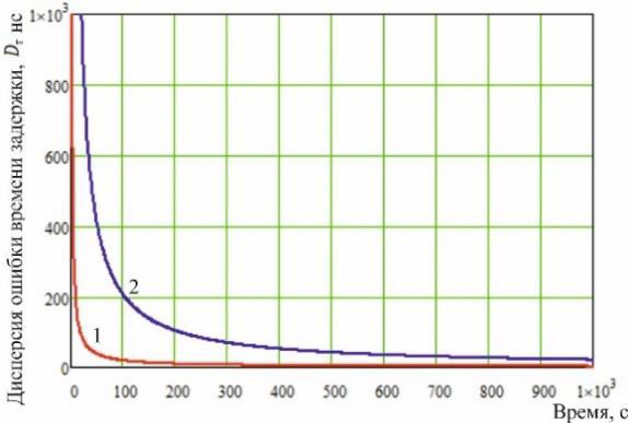 Рисунок 5 – Дисперсия ошибки оценки времени задержки: 1 – при корректной работе; 2 – при расходимости.