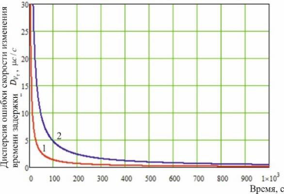 Рисунок 6 – Дисперсия ошибки оценки скорости изменения времени задержки: 1 – при корректной работе; 2 – при расходимости.