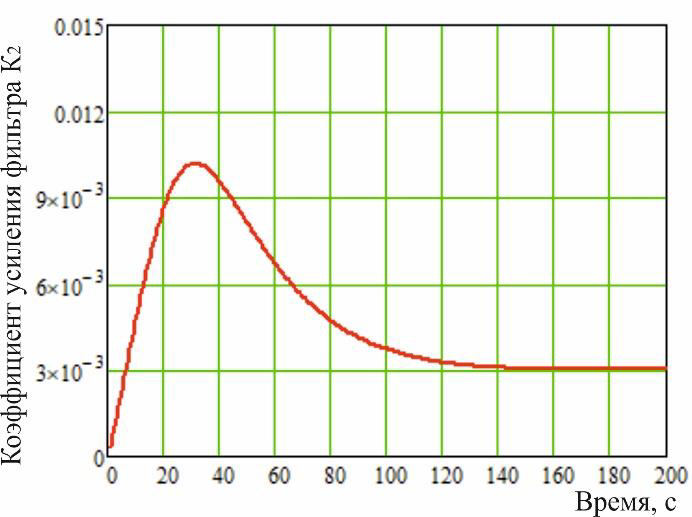 Основная причина расходимости процесса фильтрации – быстрое стремление к нулю коэффициента передачи (усиления) К фильтра Калмана, как показано на рисунках 7, 8. При этом процесс оценивания перестает быть зависимым от обновляющей информации, содержащейся в последовательности наблюдений, и рост ошибки не влияет на формирования оценки.