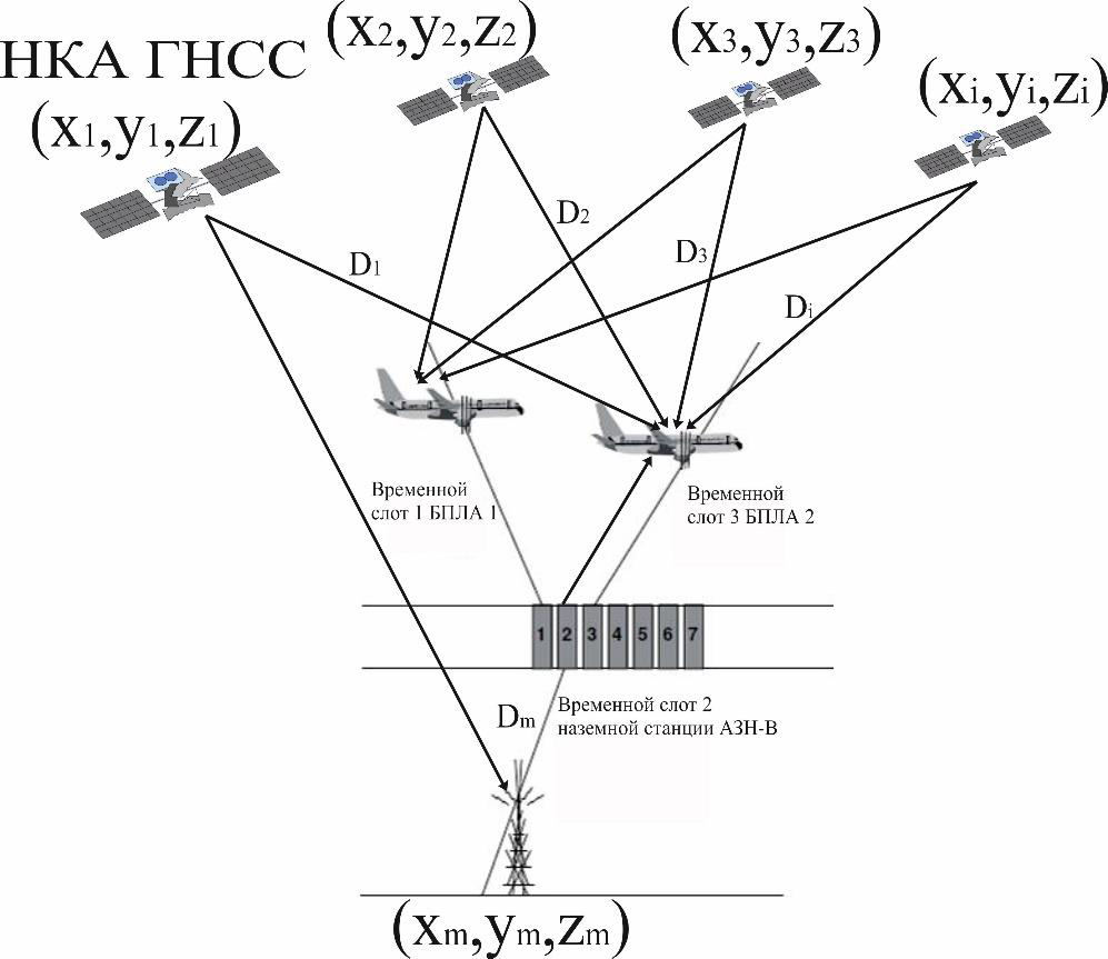 где – дальность до i-того ИНИ (НКА и НС АЗН-В); – координаты i-того ИНИ; x, y, z – координаты БПЛА.