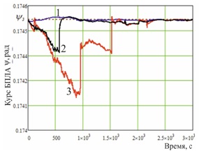 Зависимости значений курса БПЛА от конфигурации ИНИ представлены на рис. 5: кривая 1 – оценка курса при 1 конфигурации, кривая 2 – оценка курса при 2 конфигурации; оценка курса при 3 конфигурации; – заданный курс полета. На рис. 6 приведены зависимости значений дисперсии ошибки курса БПЛА: кривая 1 соответствует 1 конфигурации, кривая 2 – 2 конфигурации; кривая 2 – 2 конфигурации.