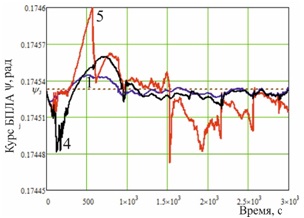 Для повышения эффективности алгоритма управления траекторией предлагается использовать данные от НС АЗН-В, что приводит к расширению вектора псевдодальномерных измерений. На рис. 7, 8 приведены графики зависимости курса полета БПЛА от конфигурации ИНИ и дисперсии ошибки курса для 4-ой и 5-ой конфигурации ИНИ.
