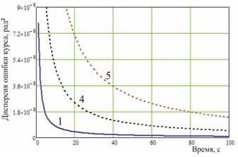 Рисунок 9 – Дисперсии ошибок оценки курса полета для конфигураций 1, 4, 5