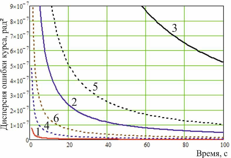 На рисунке 9 представлены расчетные значения дисперсии ошибки определения курса для всех моделируемых конфигураций ИНИ: непрерывными линиями показаны графики ошибки при работе только по НКА ГНСС, пунктирными линиями обозначены графики дисперсии при использовании сигналов НС АЗН-В.