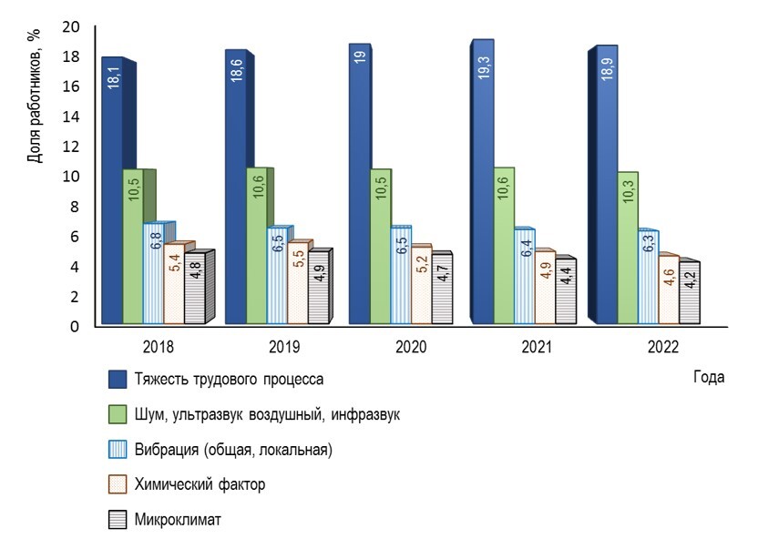 Рисунок 4 Доля работающих во вредных и (или) опасных условиях труда, относительно общего количества занятых в РФ в 2018–2022 гг., в %