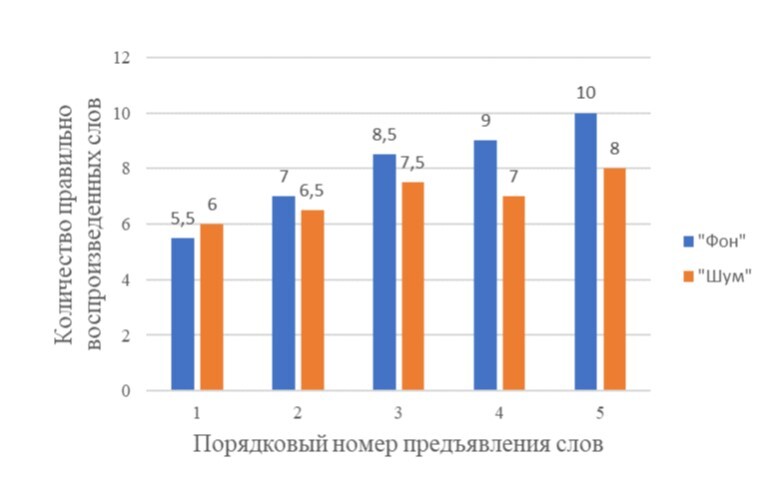 В условиях зашумлённости установлено снижение количества правильно воспроизведенных слов, что подтверждает негативное влияние шума как стресс-фактора на внимание, переработку информации и утомляемость.