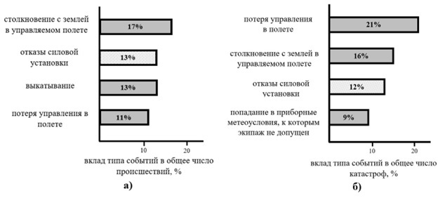 Рисунок 1 – а) – основные типы событий, приведшие к авиационным происшествиям с самолетами коммерческой авиации (период 2001 – 2018 годы); б) – основные типы событий, приведшие к катастрофам самолетов коммерческой авиации (период 2001 – 2018 годы). Источник: https://rostransnadzor.gov.ru/storage/img/avia/analiz_po_bezopasnosti_poletov_2018.pdf?ysclid=lovu7yj94e577965939