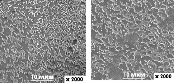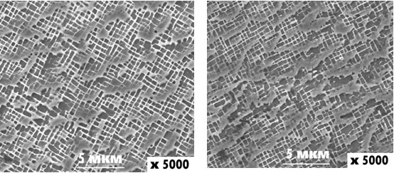 Проведены испытания четырех образцов при двух различных значениях приложенной нагрузки: 146 МПа и 206 МПа. Значение температуры было постоянным и составляло 980°С. Испытания проводились в соответствии с ГОСТ 10145-81 «Металлы. Методы испытания на длительную прочность» на электромеханической машине для испытаний на ползучесть, оснащенной трехзонной печью, а также набором оборудования, позволяющим осуществлять контроль значения нагрузки с точностью до 0,5%. По истечении 100 и 300 часов нагружения (до наступления разрушения образцов) испытания останавливались. Из образцов были изготовлены шлифы. После их предварительной обработки путем полировки и травления, произведен анализ микроструктуры шлифа с использованием растрового электронного микроскопа. На рисунке 3 и 4 представлены микроструктуры сплавов образцов.