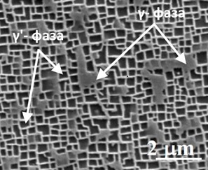 Лопатки турбин современных авиационных ГТД изготавливают из литых жаропрочных никелевых сплавов, что обусловлено уникальной способностью этого типа металлов выдерживать широкий спектр нагрузок, связанных с воздействием центробежных сил, знакопеременных нагрузок, сил от газового потока в условиях воздействия высоких температур [Recrystallization…, 2022]. Кроме того, жаропрочные никелевые сплавы отличаются коррозионной стойкостью и стойкостью к окислению. Высокие прочностные характеристики жаропрочных никелевых сплавов обусловлены особенностью их микроструктурного строения, основой которого является γ-матрица, сформированная на основе , с включенными в нее дисперсными элементами ϒ'- фазы, имеющими в начальном состоянии кубическую, либо близкую к кубической форму (рис. 5) [Mechanical properties…, 2014].