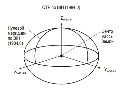 На рисунке 2 изображены начало координат и оси системы координат WGS-84, которые также служат геометрическим центром и осями X, Y и Z эллипсоида WGS-84.