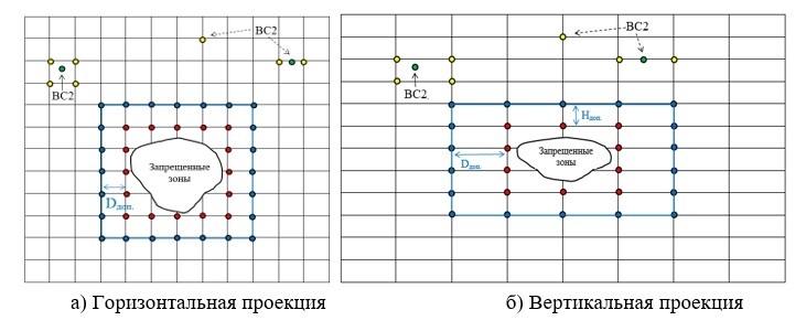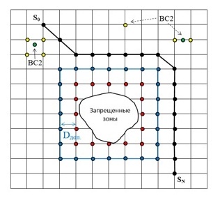 Запретными узлами называются узлы сетки, попадающие (красные точки на рисунке 3) в запрещенные зоны (запретные для полетов зоны, зоны СМУ) и окружающие узлы (красные точки на рисунке 3), ближайшие к границам этих зон, и также узлы (синие точки на рисунке 3) в некотором заданном диапазоне Dдоп допустимой области безопасности. Далее эти запретные узлы будут добавлены в список CLOSELIST и не будут рассматриваться алгоритмом А* при формировании оптимальной траектории обхода.
