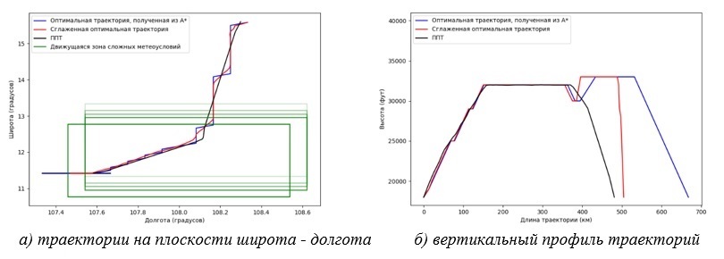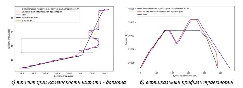 После идентификации запретных узлов или обнаружения опасных сближений (конфликтов), варианты ее разрешения автоматически рассчитываются по процедуре алгоритма А*, в результате работы которого получена оптимальная 4D-траектория обхода.
