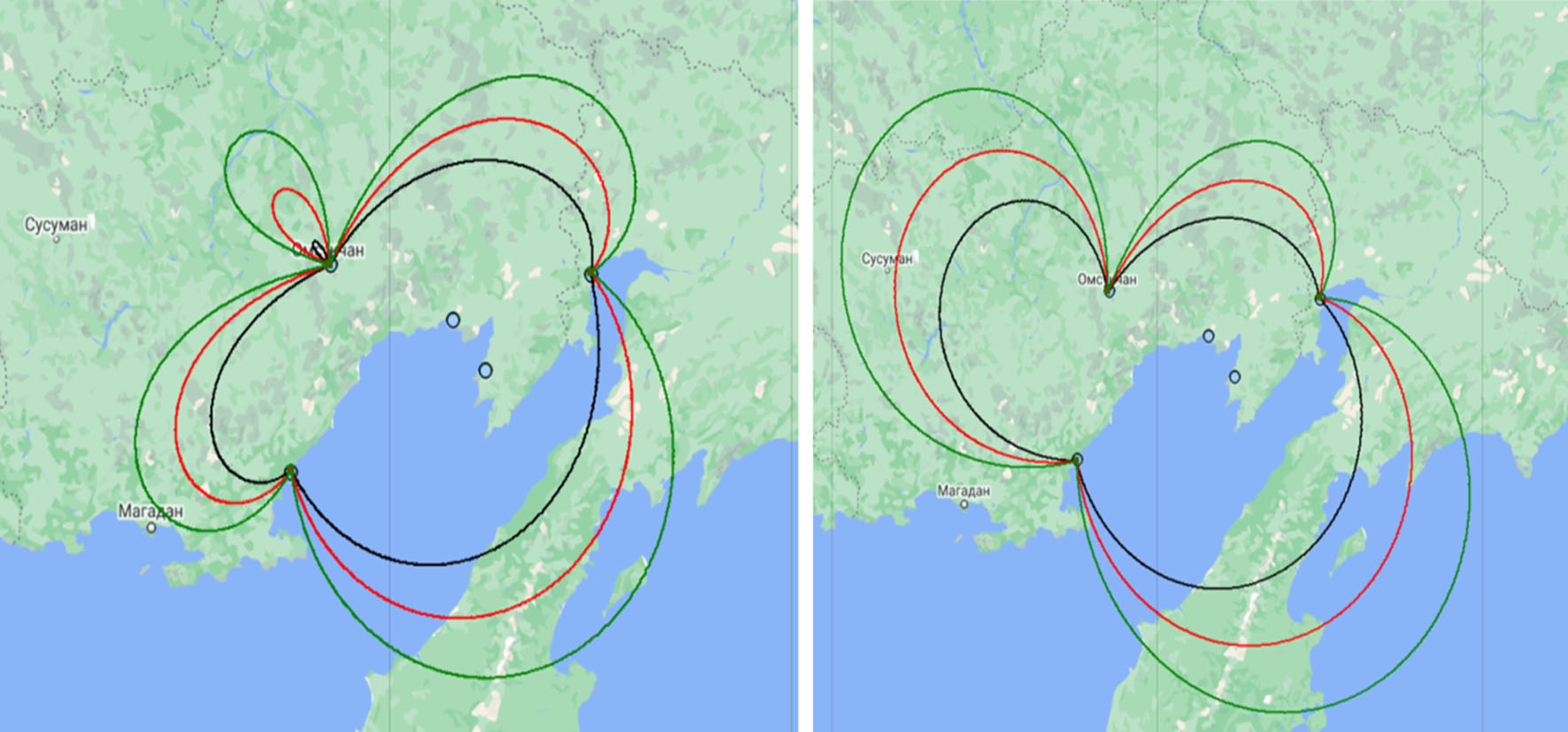 На работоспособность МПСН (точностные характеристики) существенно влияет топология размещения позиций системы, а именно геометрический фактор (места расположения НЗ) и размеры зон покрытия [Using…, 2022]. Расчет данных характеристик производился путем построения зоны видимости системы с учетом дальности установки приемников друг от друга и их количества применительно к трем областям воздушного пространства Российской Федерации, находящимся под управлением региональных центров ОрВД: Иркутским, Нерюнгринским и Магаданским.