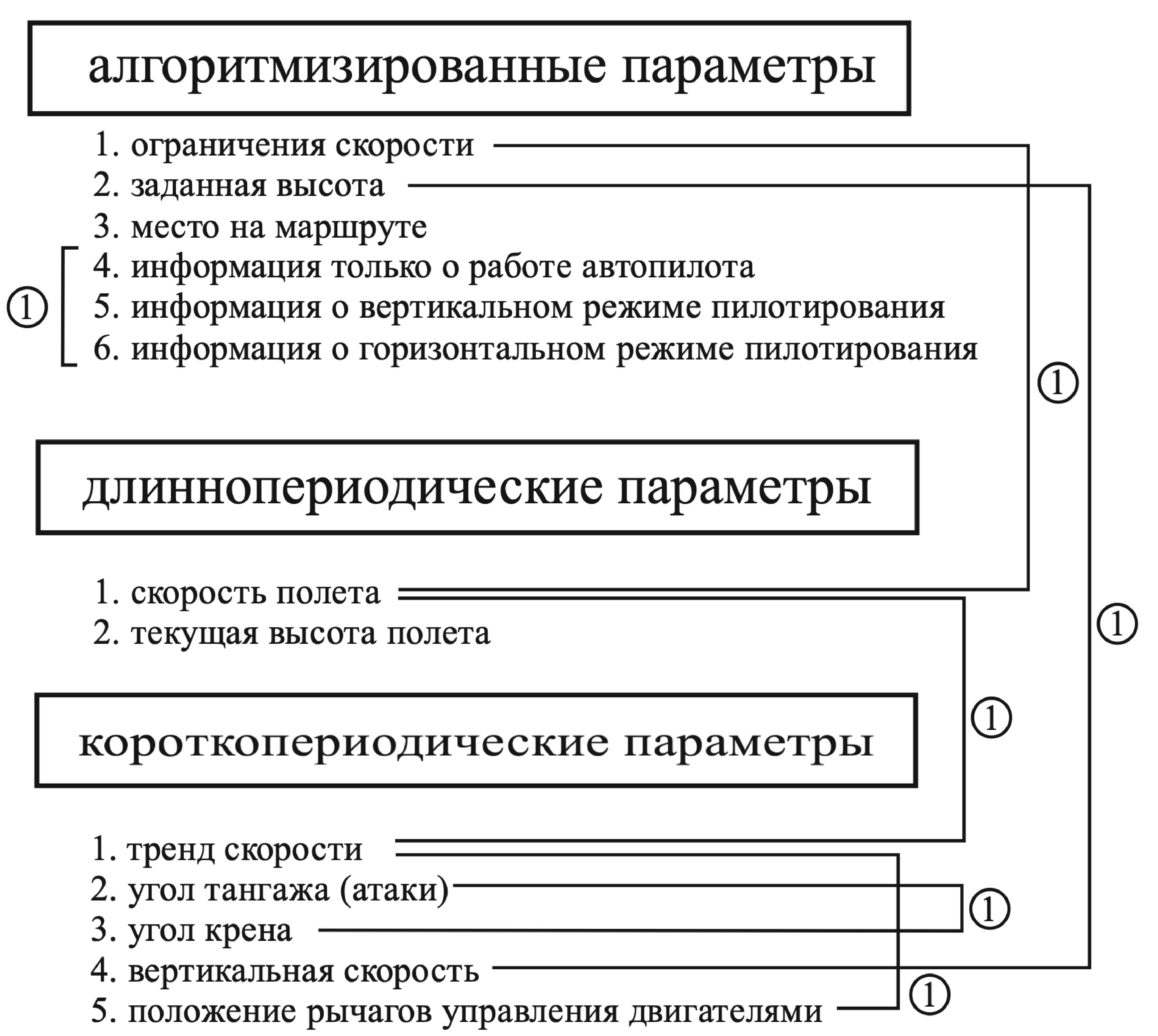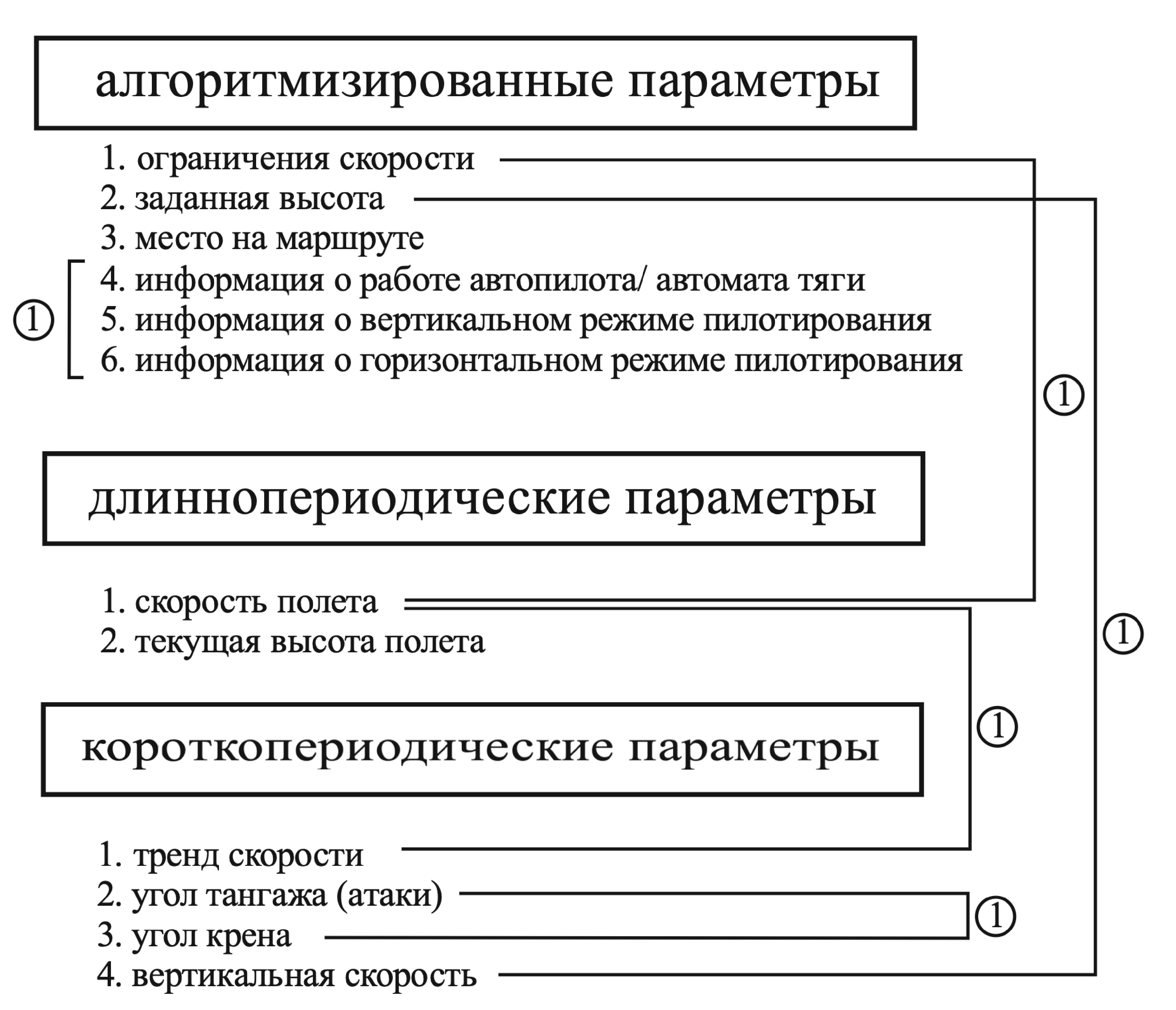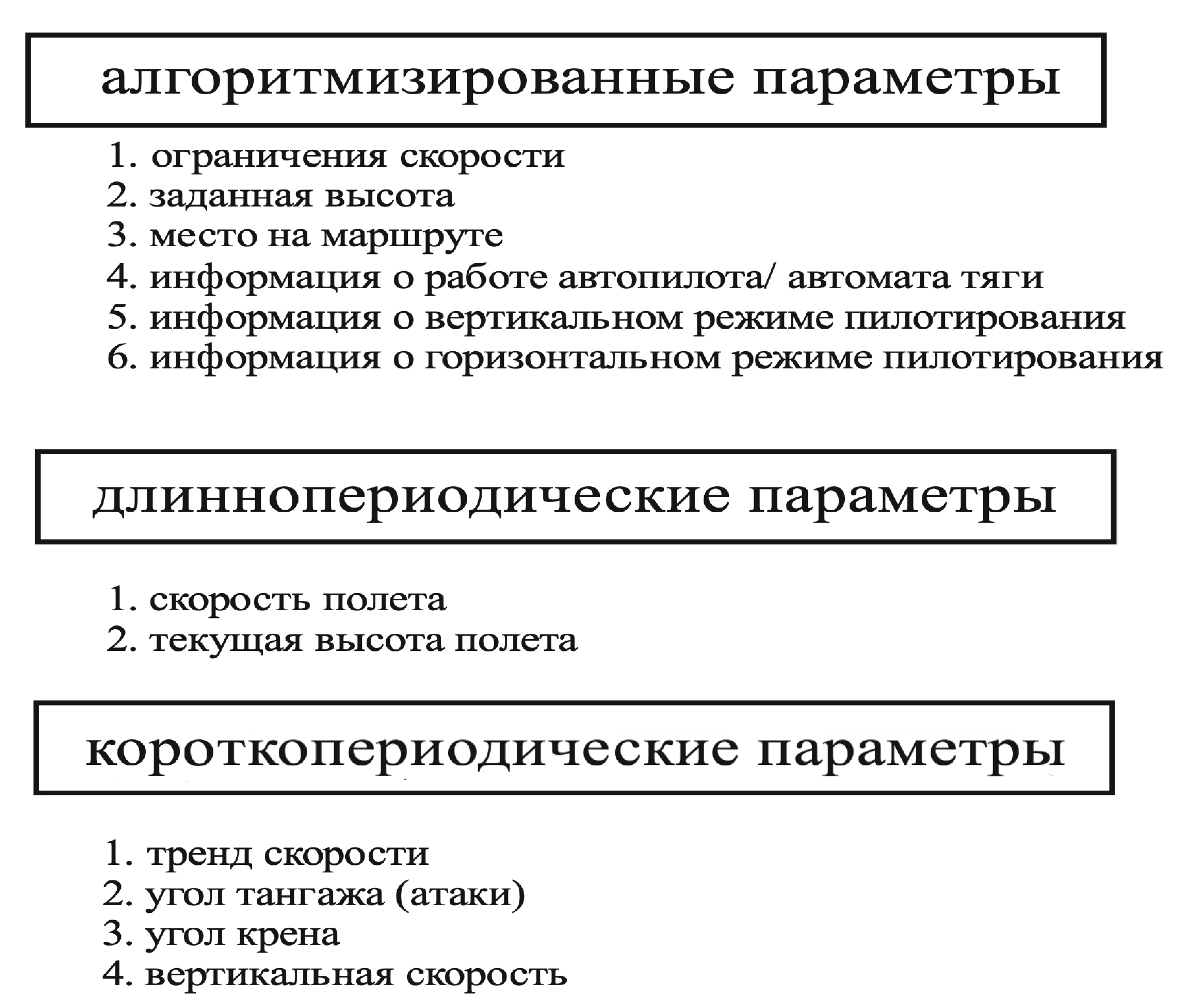 - Алгоритмизированные параметры (АП) –такие параметры полета ВС и его систем, которые характеризуют степень и состояние режима пилотирования самолетом (автоматизированный, директорный, ручной и т.д.).