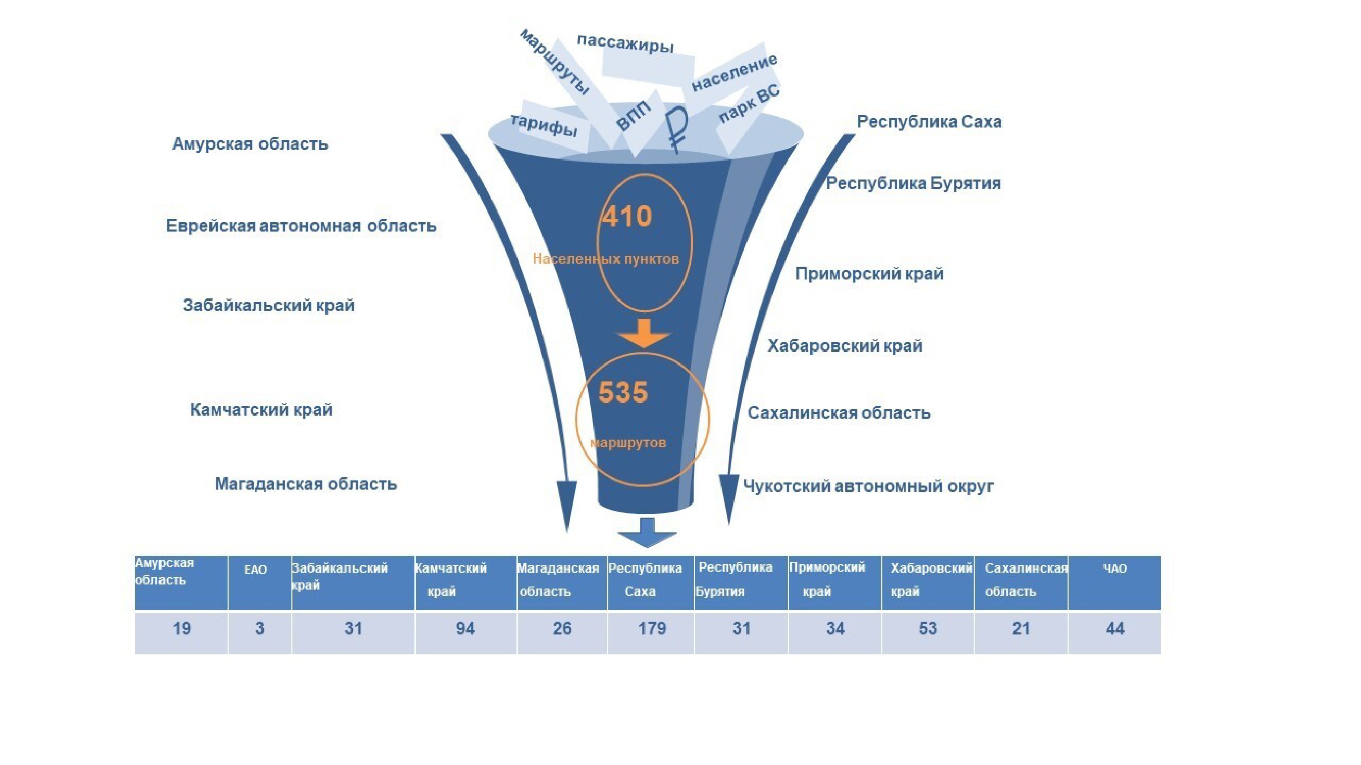 На данный момент составлен реестр труднодоступных населенных пунктов, куда можно добраться только самолетом. Их соединят со столицами субъектов ДФО 535 региональными местными маршрутами. К 2025 году планируется увеличить пассажиропоток от 1 до 2 млн пассажиров за счет пополнения воздушного флота 45 отечественными самолетами [Горбунов, 2023].