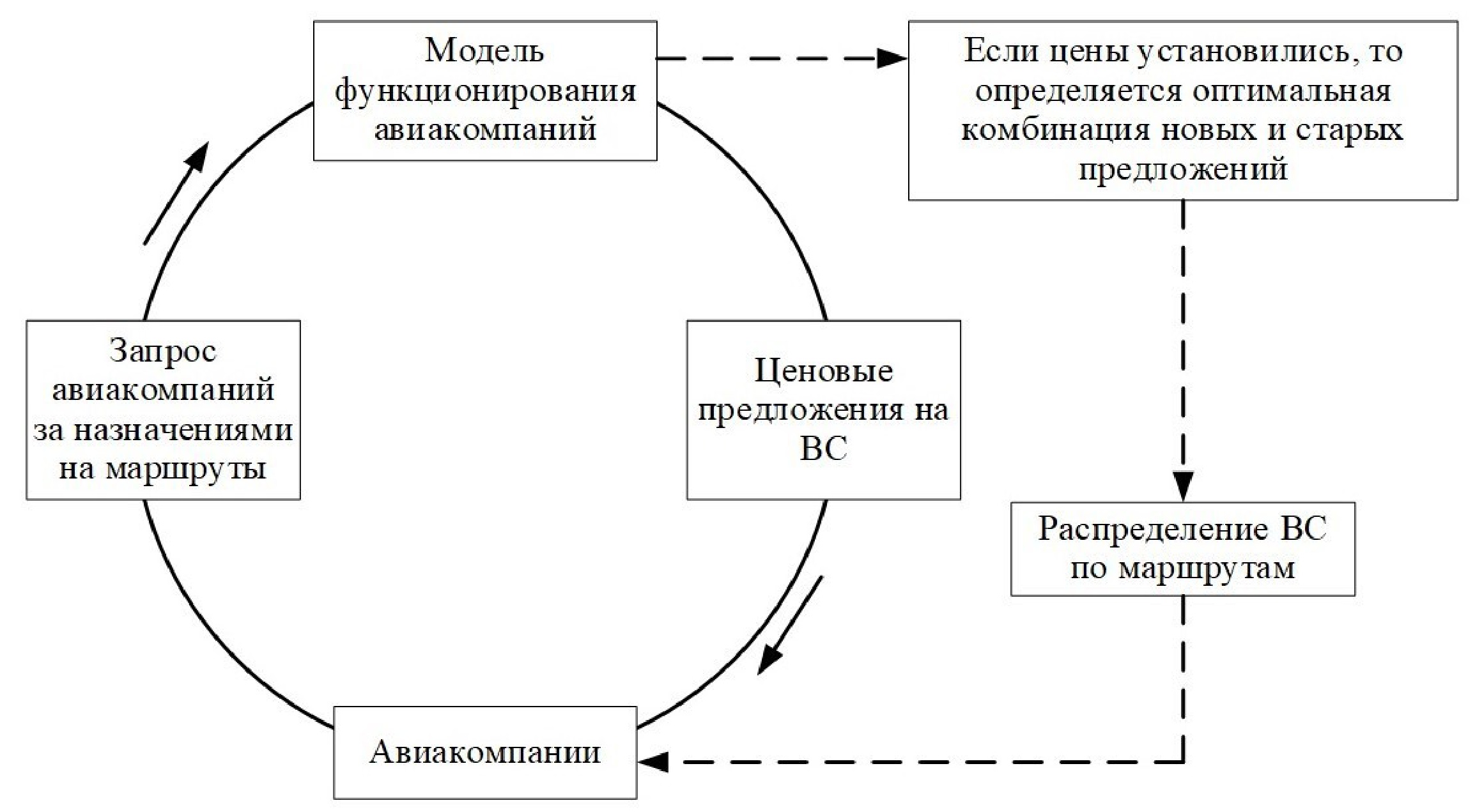 С другой стороны, авиакомпании также принимают решение о покупке того или иного типа ВС в необходимом ей количестве в зависимости от летно-технических характеристик ВС, его стоимости, стоимости поддержания летной годности и предполагаемых маршрутов в маршрутной сети авиакомпании [Магдин и др., 2019]. Этот итерационный процесс согласования цен и назначенных маршрутов, представленный на рис. 2, продолжается до тех пор, пока авиакомпании и авиапромышленность не придут к компромиссу.
