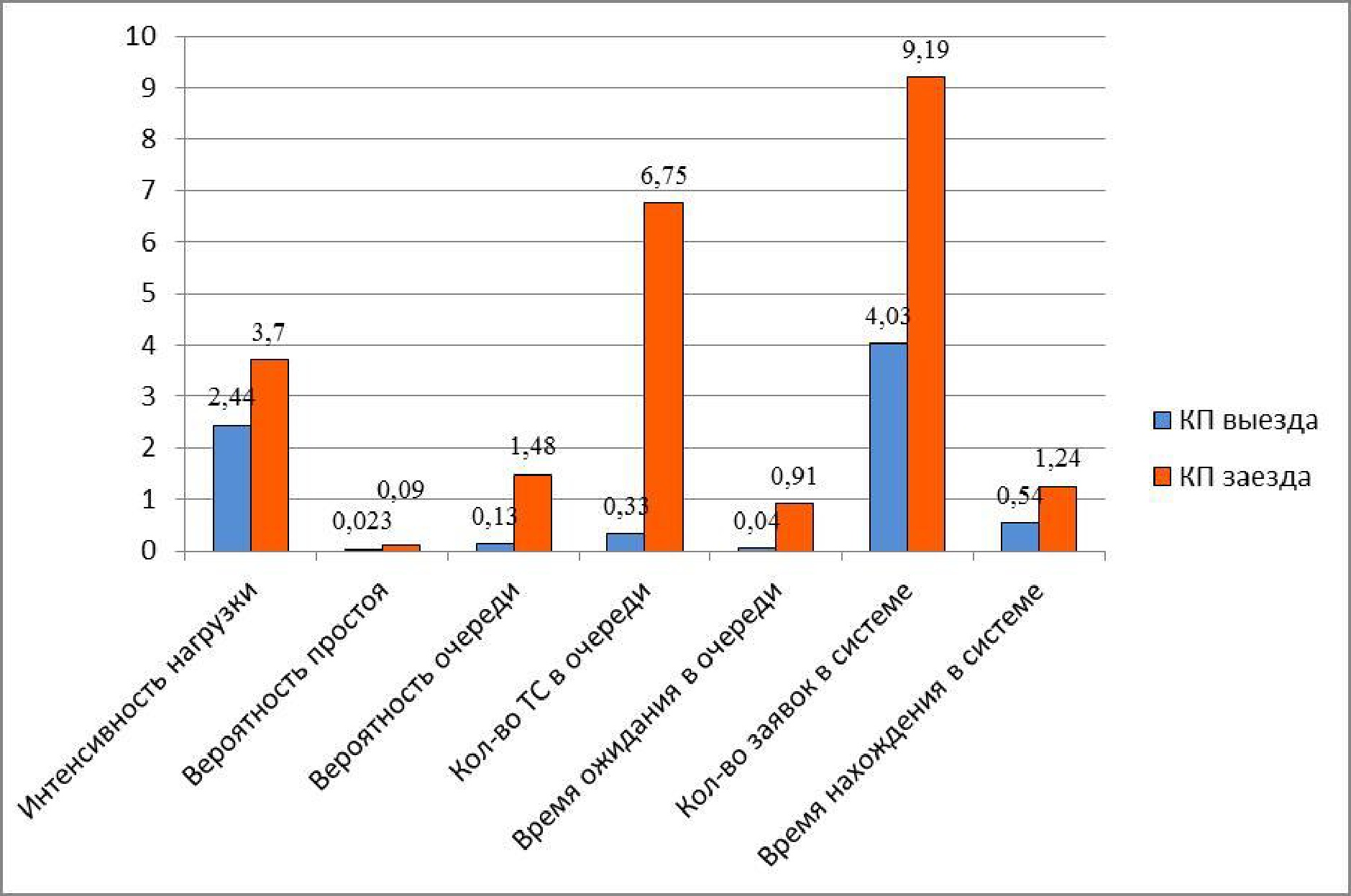 Из рисунка 3 следует, что интенсивность нагрузки пунктов выезда выше, чем интенсивность нагрузки пунктов въезда на 51,64%. Соответственно, вероятность простоя на пунктах въезда незначительно выше. Также есть значительная разница в очереди, на заезде образуются заторы, состоящие в среднем из семи машин, время ожидания которых составляет 54,6 секунд. Число автомобилей, находящихся в обслуживании и в очереди (количество заявок), также превышает: 4 транспортных средства на выезде и 9 на въезде, что свидетельствует об увеличении времени нахождения в системе.