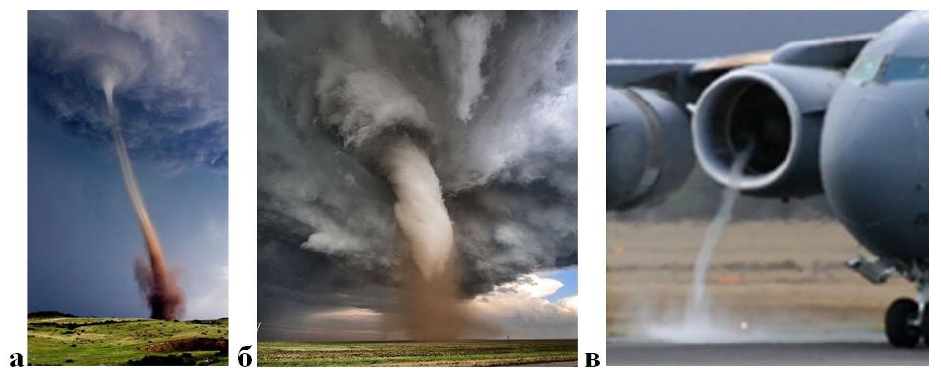 Рисунок 1– Вихри у подстилающей поверхности: а – смерч с признаком вихревой трубки, Источник: https:// klike.net/uploads/posts/2023-03/1679976725_3-57.jpg; б – торнадо с активной вихревой трубкой, Источник: https://stihi.ru/pics/ 2021/05/19/ 4292.jpg; в – техногенный вихрь стокового типа перед работающим ГТД на земле, Источник: https://i.pinimg.com/originals/10/bd/3a/10bd3a3f62027ca5bbcd403d8ada41f1.jpg