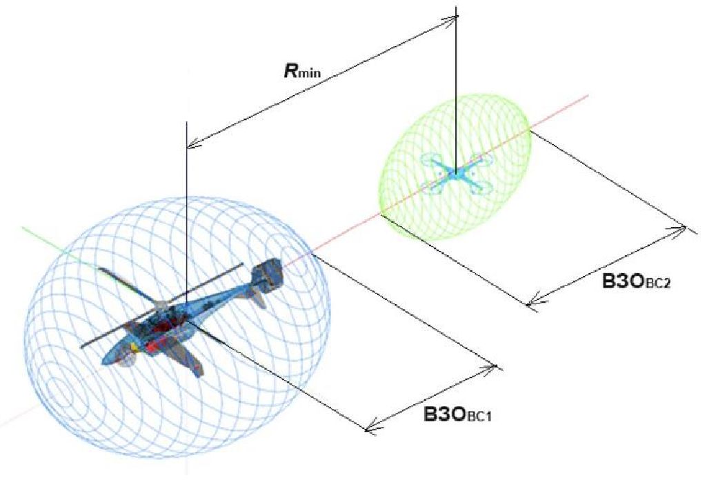 Для обеспечения безопасности полетов в динамично изменяющемся ВП вокруг каждого пилотируемого и беспилотного ВС вводится виртуальная защитная область (ВЗО) в виде трехосного эллипсоида (рис. 1) в связанной со строительными осями ВС системе координат, пересечение границы которой другим объектом квалифицируется как конфликтная ситуация.