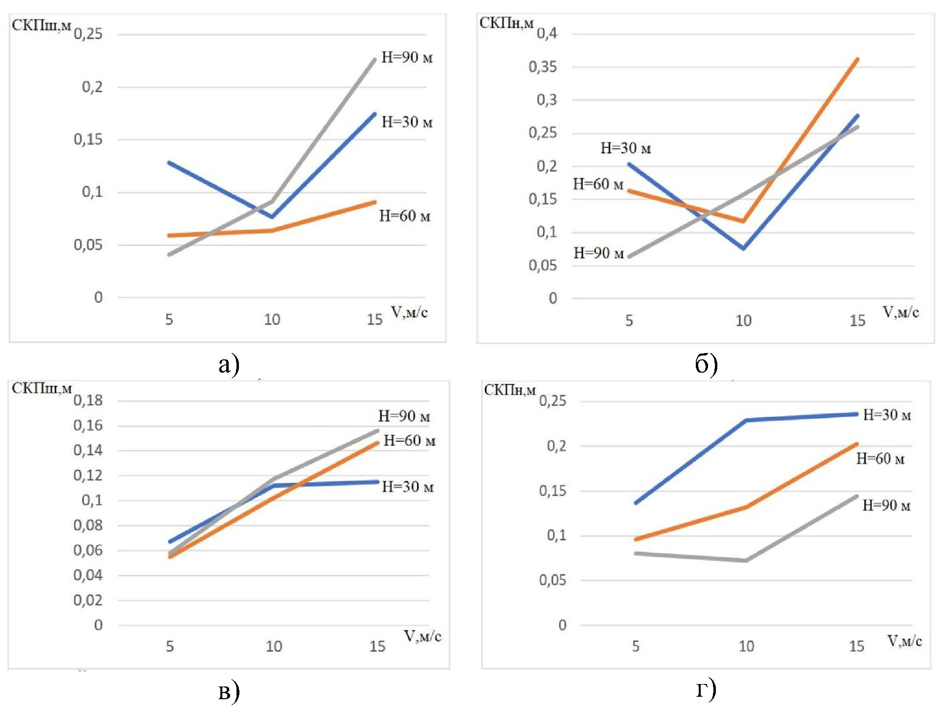 Рисунок 8 – Зависимость СКП измерения координат от скорости полета БВС: а) СКПШ широты, участок 2; б) СКПН высоты, участок 2; в) СКПШ широты, участок 4; г) СКПН высоты, участок 4