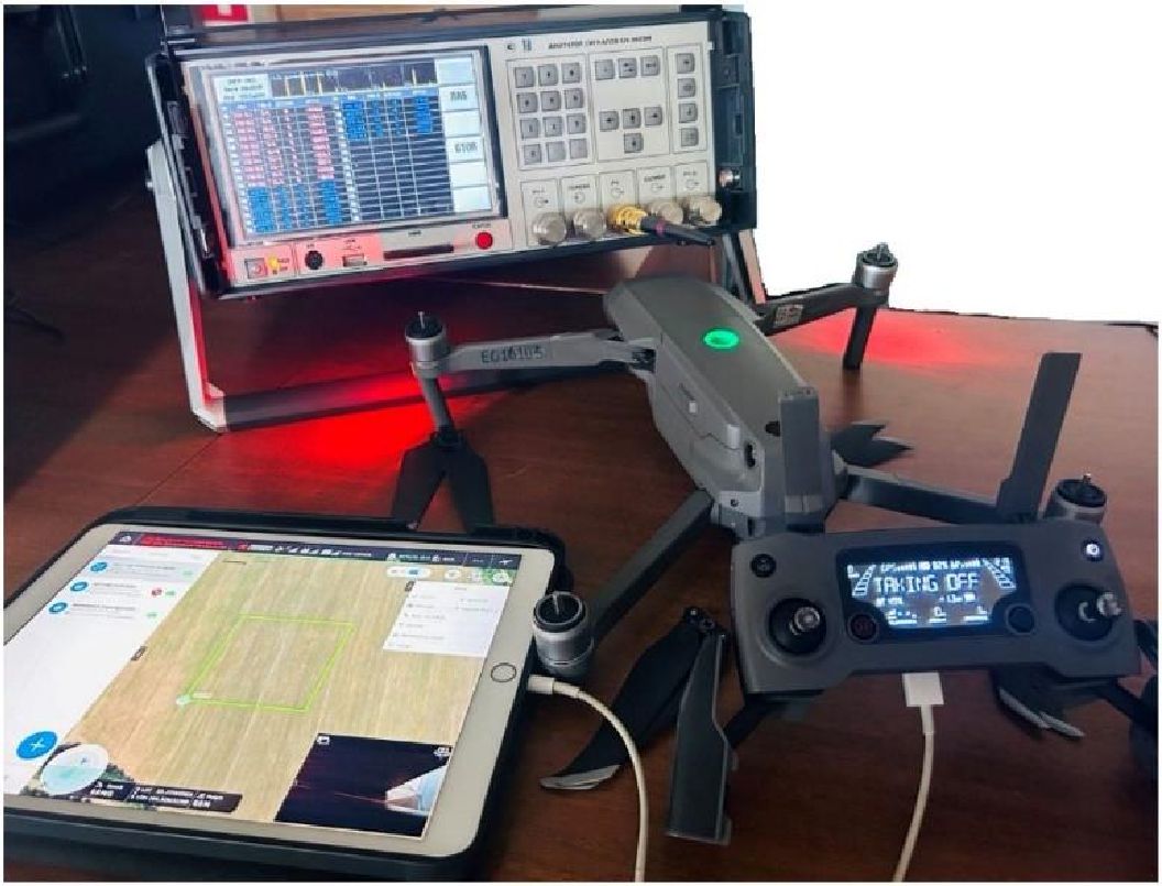 С этой целью проведены полунатурные эксперименты с использованием имитатора спутниковых сигналов СН-3803М (рис. 9), с помощью которого было воспроизведено видимое спутниковое созвездие системы ГЛОНАСС/GPS. В ходе экспериментов БВС устанавливалось рядом с антенной СН-3803М со снятыми пропеллерами для захвата формируемых радиосигналов видимого созвездия. При запуске электромоторов осуществлялась запись данных в log-файл, что позволило осуществить их последующую обработку.