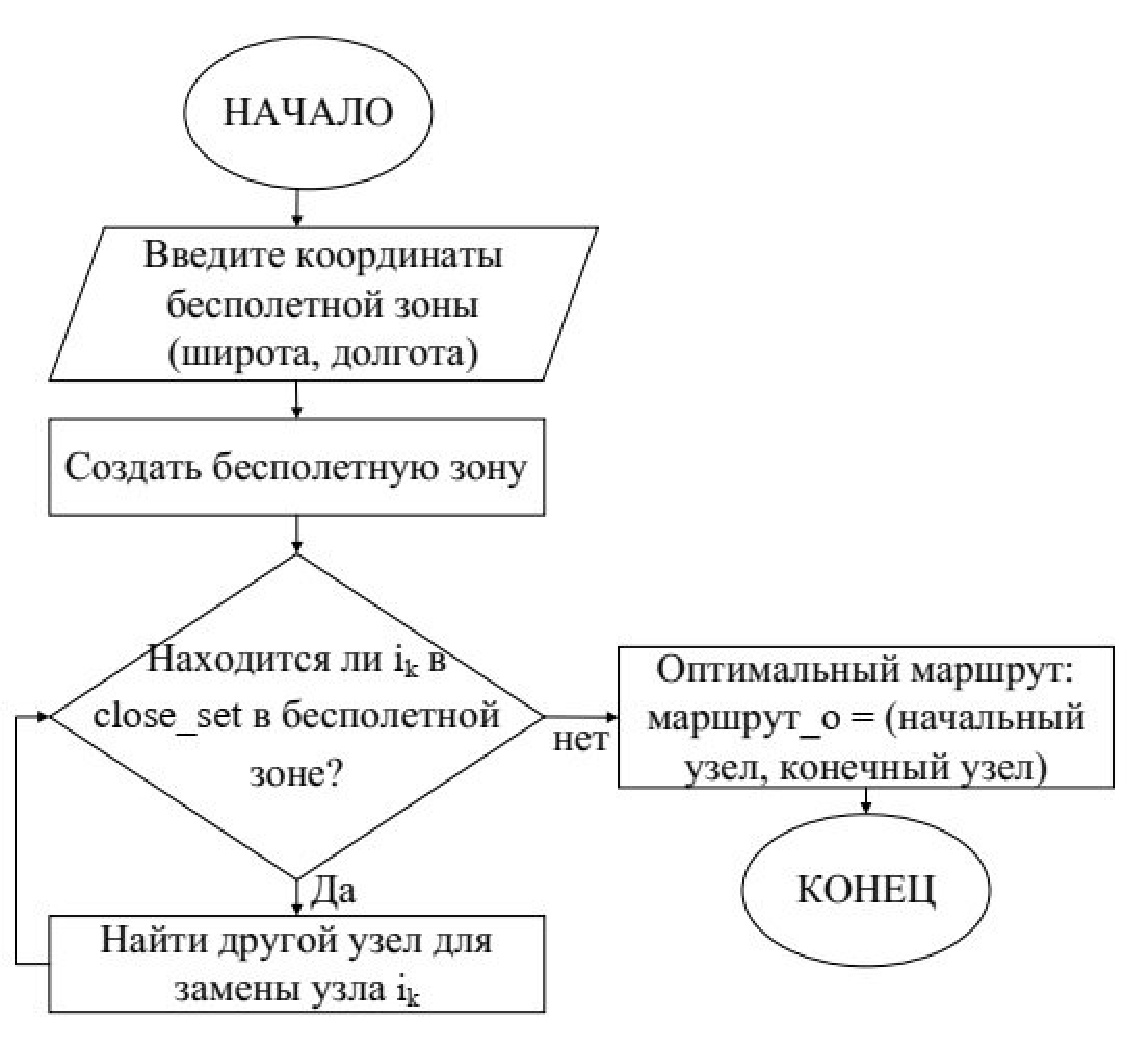 Далее координаты бесполётной зоны обрабатываются в ВП, чтобы убедиться, что маршрут ОВД их избегает (уравнение 13). В сети промежуточных точек зоны представлены наборами точек, что ускоряет алгоритм A-star, исключая их из поиска. Блок-схема обработки бесполётных зон показана на рис. 4.