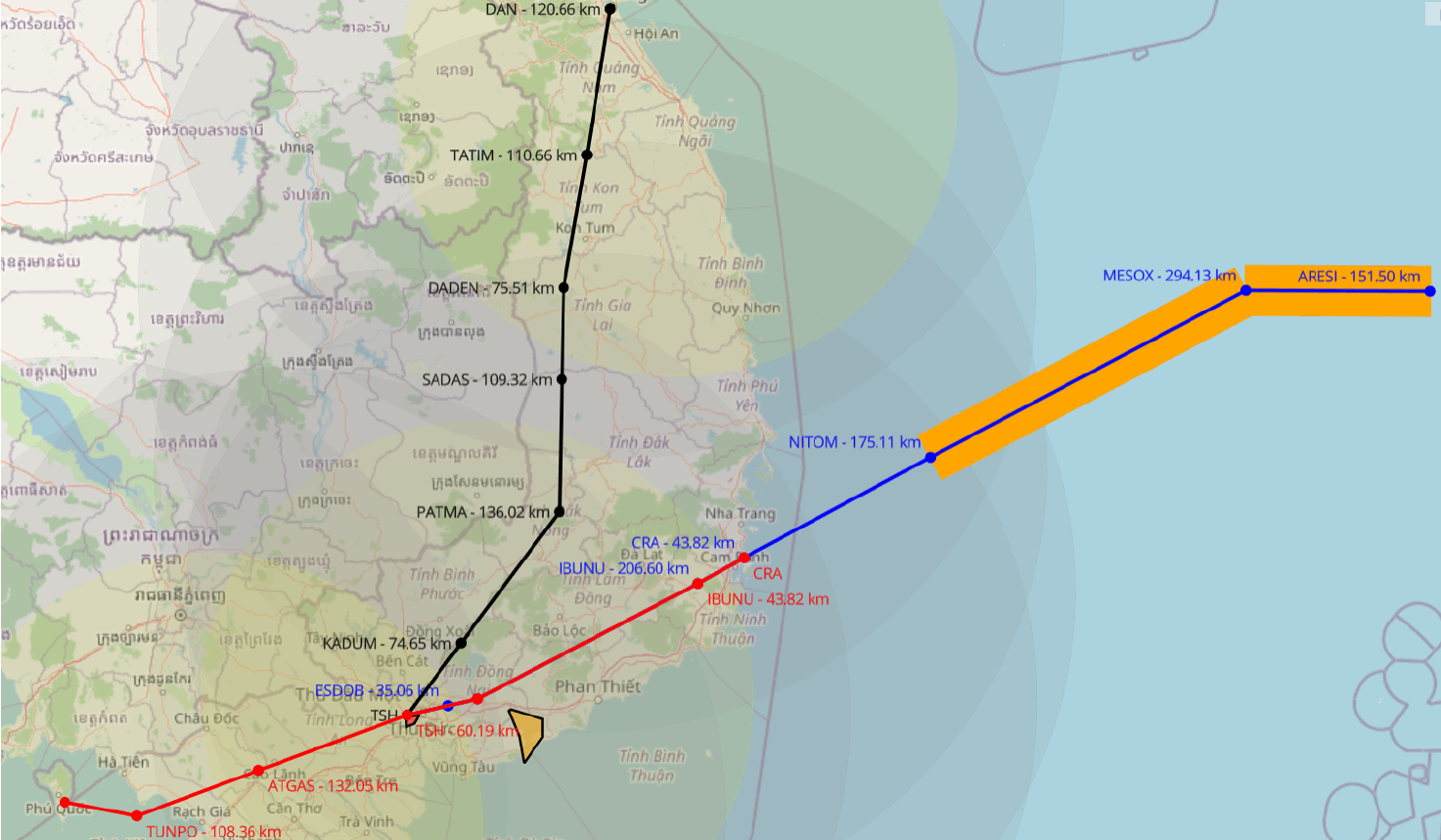 - международный аэропорт Тан Сон Нхат (VVTS) – точка передачи управления ARESI. Причина выбора: это маршрут ОВД, соединяющий аэропорт Тан Сон Нхат с Восточным морем (восток Вьетнама), который помогает соединить аэропорт Тан Сон Нхат (аэропорт Камрань) со странами Восточной Азии, такими как Япония и Корея;