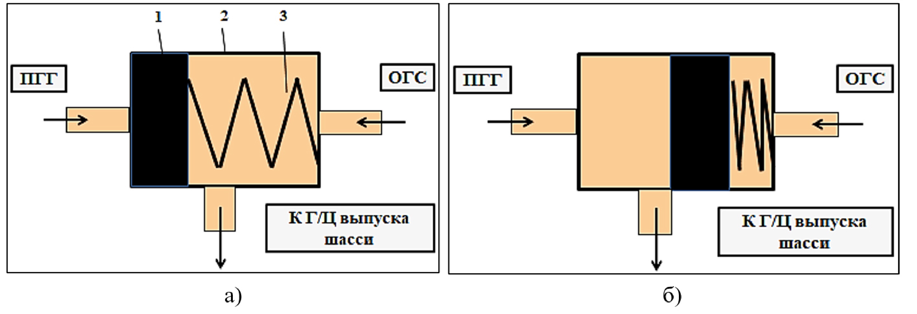 Рисунок 4. Принцип устройства переключающего клапана: 1. Поршень; 2. Корпус; 3. Пружина. а) Работа от ОГС; б) Работа от ПГГ