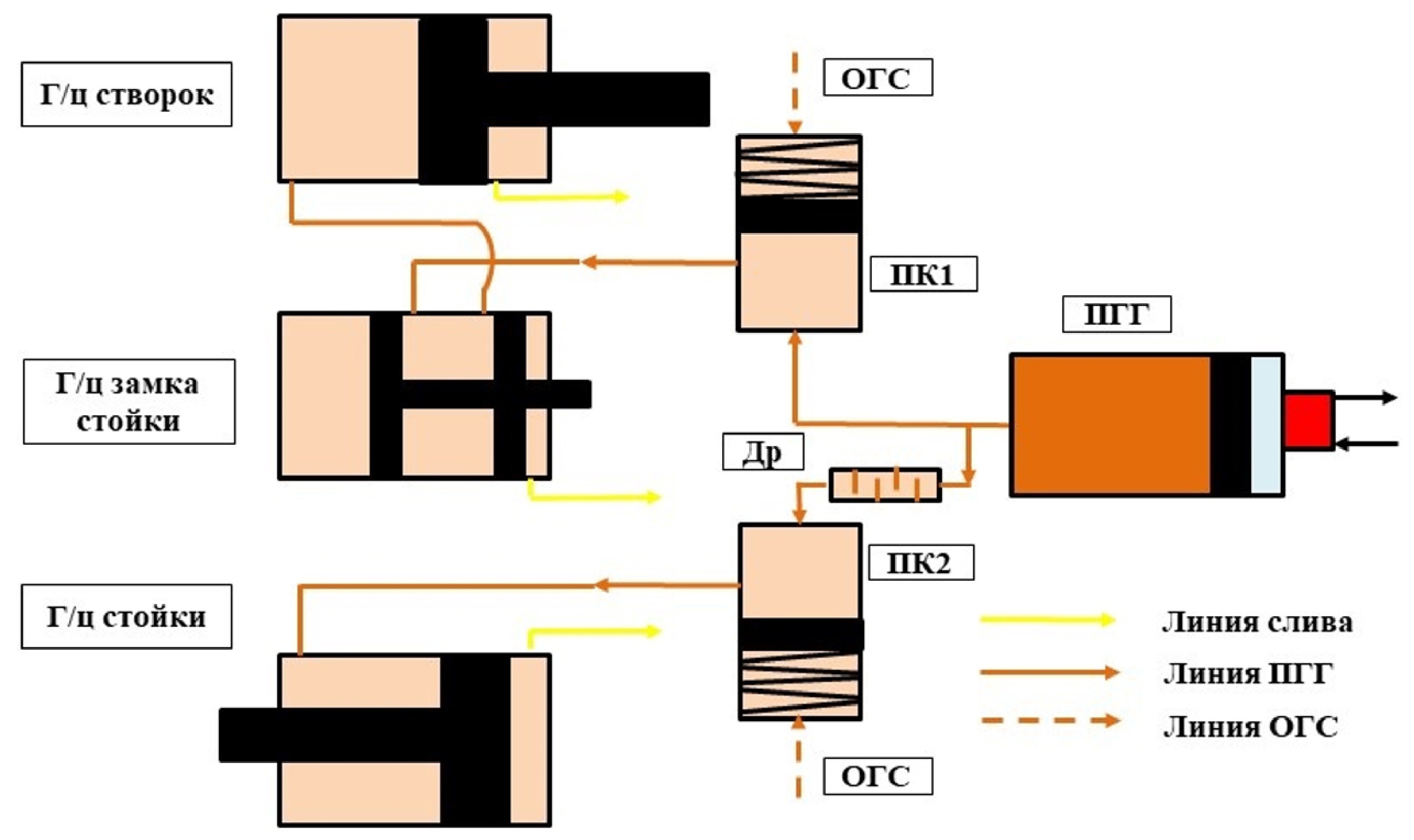 Для функционирования системы необходимо применение переключающего клапана (ПК) (рис. 4), который перекроет магистраль ОГС и откроет подачу жидкости от ПГГ к цилиндрам выпуска шасси при отсутствии давления в ОГС.