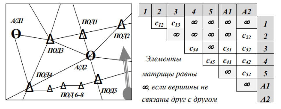 - Вершины графа, соответствующие пересечениям маршрутов, пропускают потоки ВО с учетом эшелонов движения, в связи с чем представляются в виде векторов;
