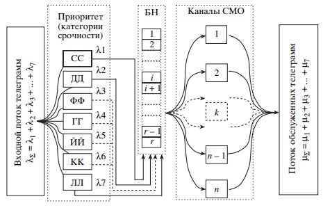 Рисунок 4. Система обслуживания с относительными приоритетами и приемом заявок на полеты ВС в раздельные секции буферного накопителя [Ребров и др., 2007, с. 100]