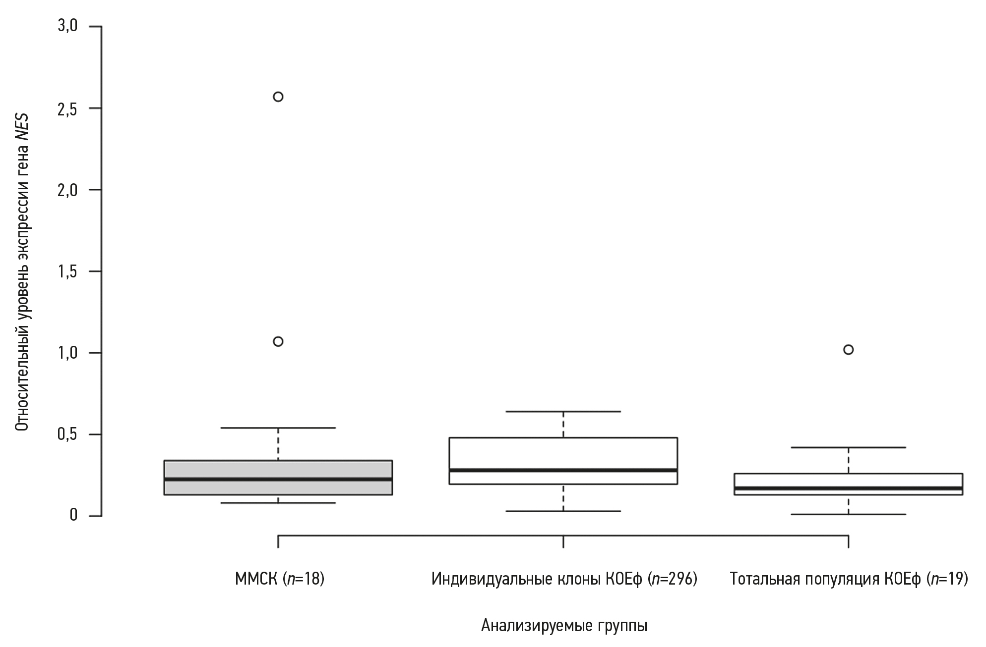 Оказалось, что средний ОУЭ гена NES статистически значимо не отличается в ММСК (0,41±0,13) и в суммарной популяции КОЕф (0,24±0,05) (рис. 1, группы ММСК и тотальная популяция КОЕф). В индивидуальных клонах КОЕф ОУЭ был статистически незначимо выше, чем в суммарной популяции (0,31±0,04) (рис. 1, группа индивидуальные клоны КОЕф).