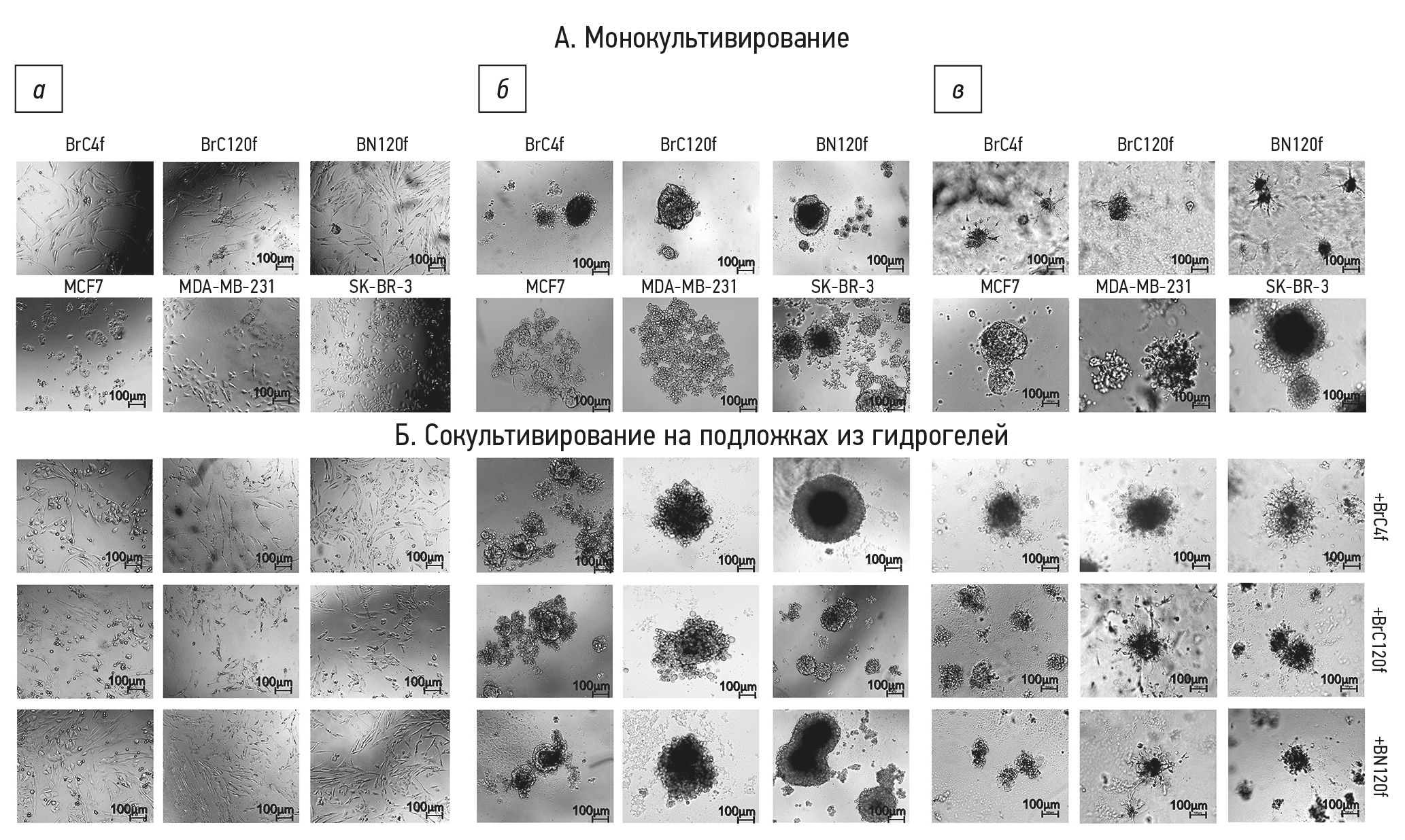 При сравнении эффективности применения простых гидрогелей для формирования гомогенных 3D- и гетерогенных 3D-2-моделей РМЖ (рис. 1) обнаружено, что на субстрате из 2% желатина не удалось получить 3D- и 3D-2-структуры РМЖ ни для одной из используемых в работе культур клеток (рис. 1, а).