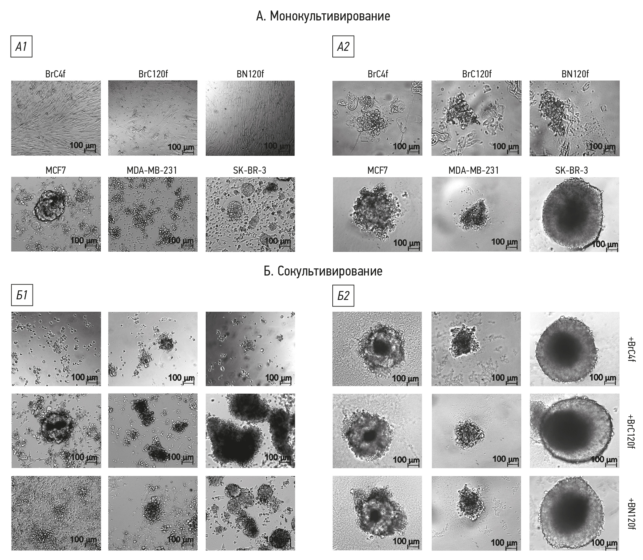 Заключение. Предложенные подходы для формирования и гомогенных (3D), и гетерогенных (3D-2) сфероидов из опухолевых и (или) стромальных клеток рака молочной железы представляют собой обобщённое руководство по наиболее эффективному способу получения сфероидов различного клеточного состава.