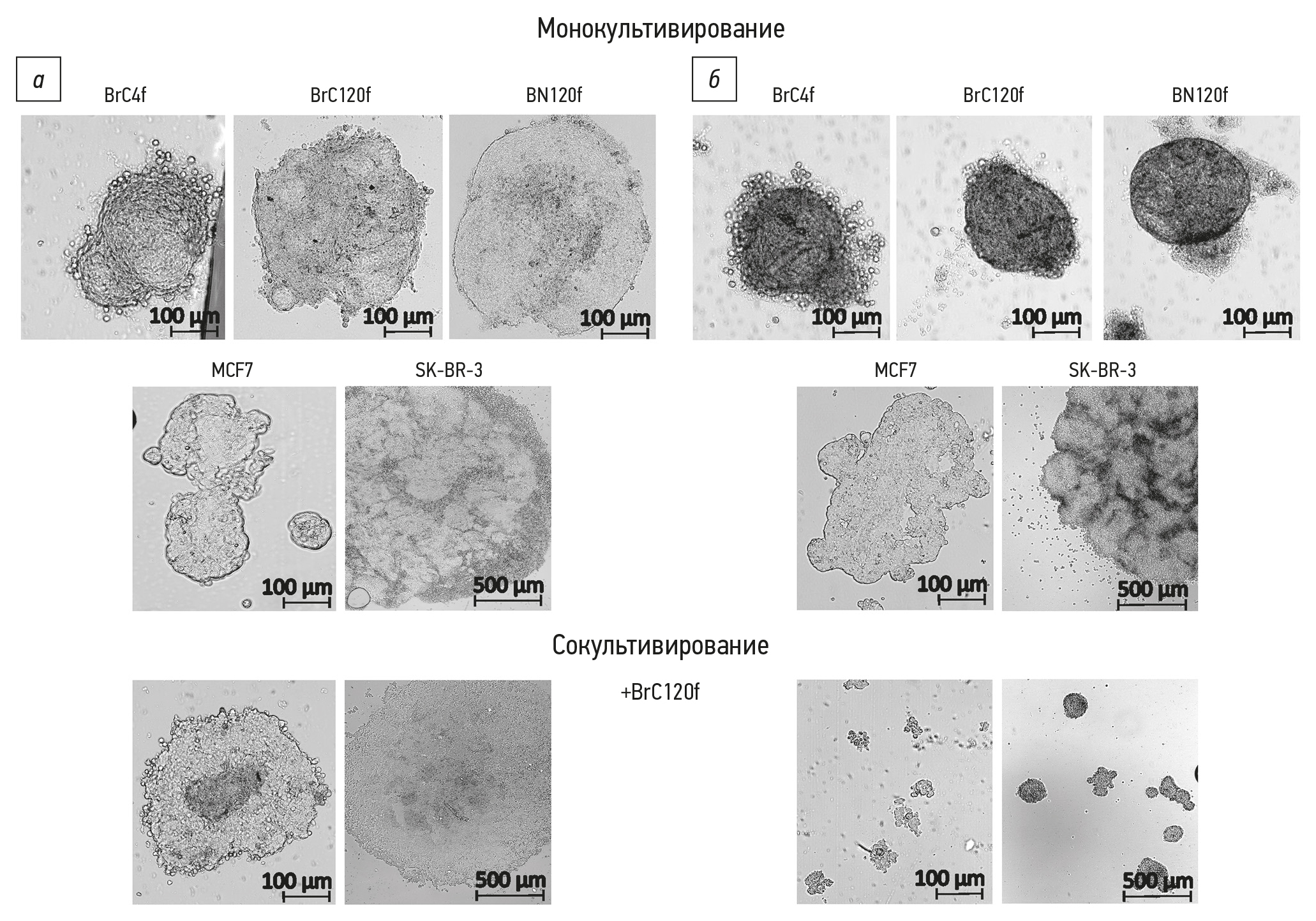 При использовании культурального пластика Eppendorf с низкими адгезивными свойствами не удалось получить сфероиды из стромальных клеток и опухолевых клеток MDA-MB-231 неэпителиального происхождения (рис. 2). Несмотря на заявляемую производителем низкую адгезию, фибробластоподобные клетки адгезировали к поверхности пластика и росли, что указывает на непригодность данного типа культурального пластика для получения 3D-структур из фибробластов. Сокультивирование опухолевых клеток линии SK-BR-3 позволило получить стабильные 3D-структуры со всеми стромальными клетками (см. рис. 2). Для опухолевых клеток линий MCF7 и MDA-MB-231 сокультивирование с клетками BrC4f также способствовало формированию гетерогенных сфероидов.