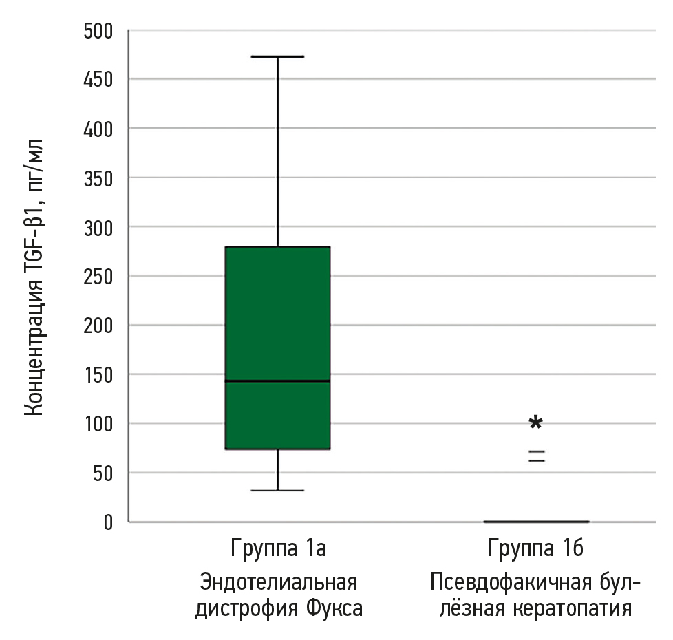 Анализ содержания TGF-β1 в ВГЖ свидетельствует о его статистически значимом повышении у пациентов группы 1а (ЭД Фукса) по сравнению с пациентами группы 1б (псевдофакичная БК) (рис. 1).