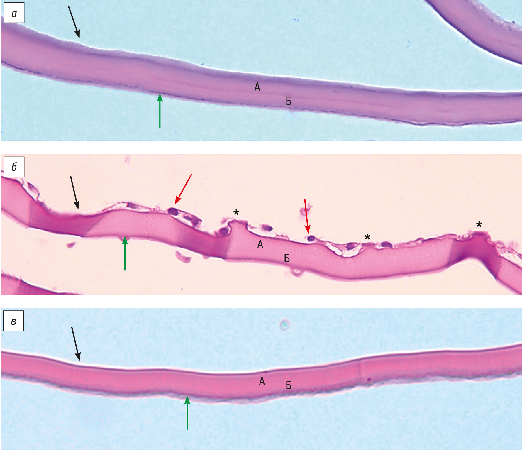 Рис. 2. Десцеметовы мембраны: a — в условиях физиологической нормы, контроль; б — при эндотелиальной дистрофии роговицы Фукса; в — при псевдофакичной буллёзной кератопатии. Эндотелиальные клетки (красные стрелки), эндотелиальная поверхность ДМ (чёрные стрелки), стромальная поверхность ДМ (зелёные стрелки); гутты (звёздочки); А — постнатальные слои; Б — пренатальный передний «полосатый» слой. Окраска гематоксилином и эозином; ×200.