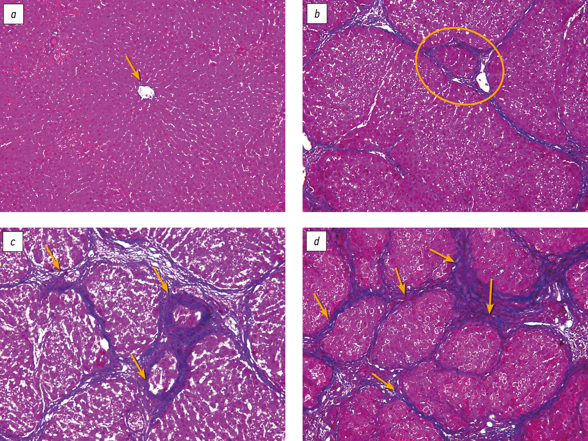Рис. 1. Фрагменты печени крыс контрольной группы (a), через 9 нед (b), 11 нед (c), 13 нед (d) после начала эксперимента. Окраска по Маллори; ×20: a — центральная вена (стрелка); b — ложная печёночная долька (овальная рамка); c — ложные печёночные дольки (стрелки); d — тотальное поражение печени, ложные печёночные дольки (стрелки).