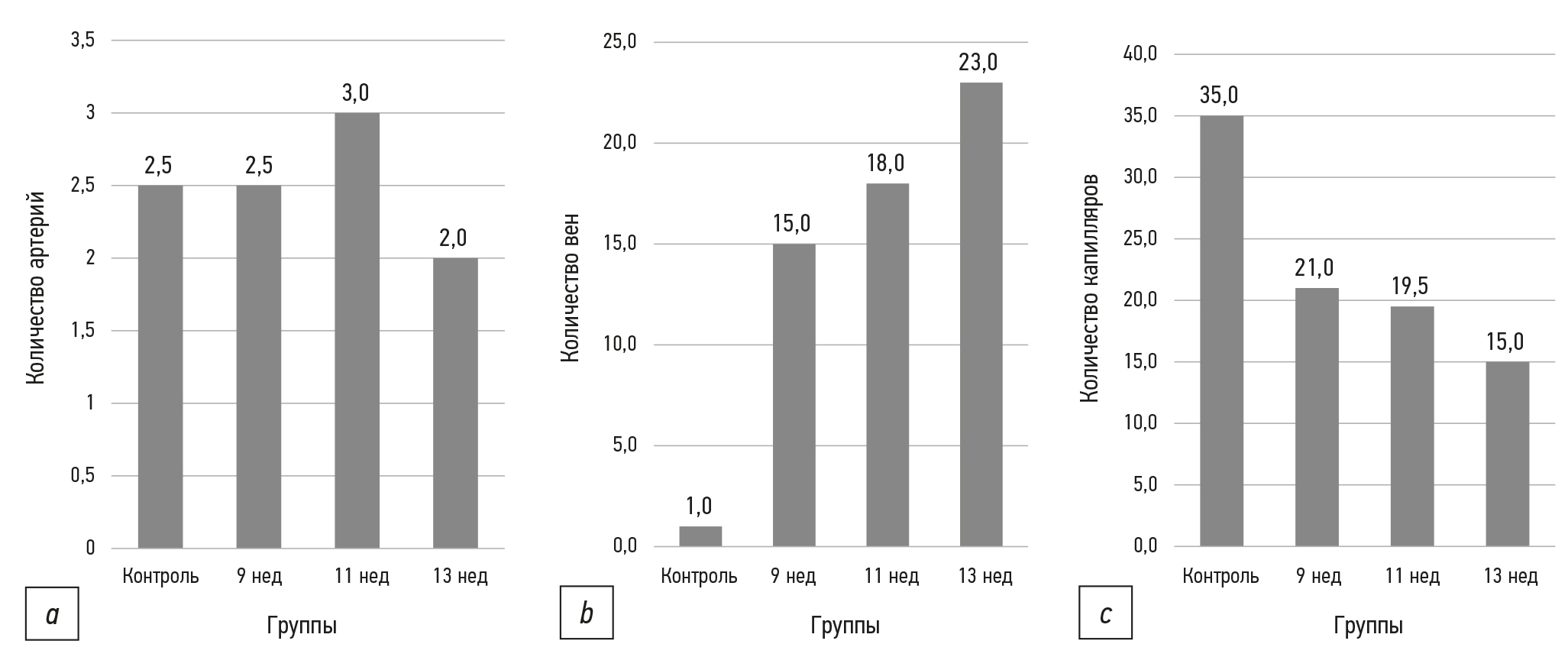 Рис. 2. Изменения количества междольковых артерий (a), междольковых вен (b) и синусоидных капилляров (c).