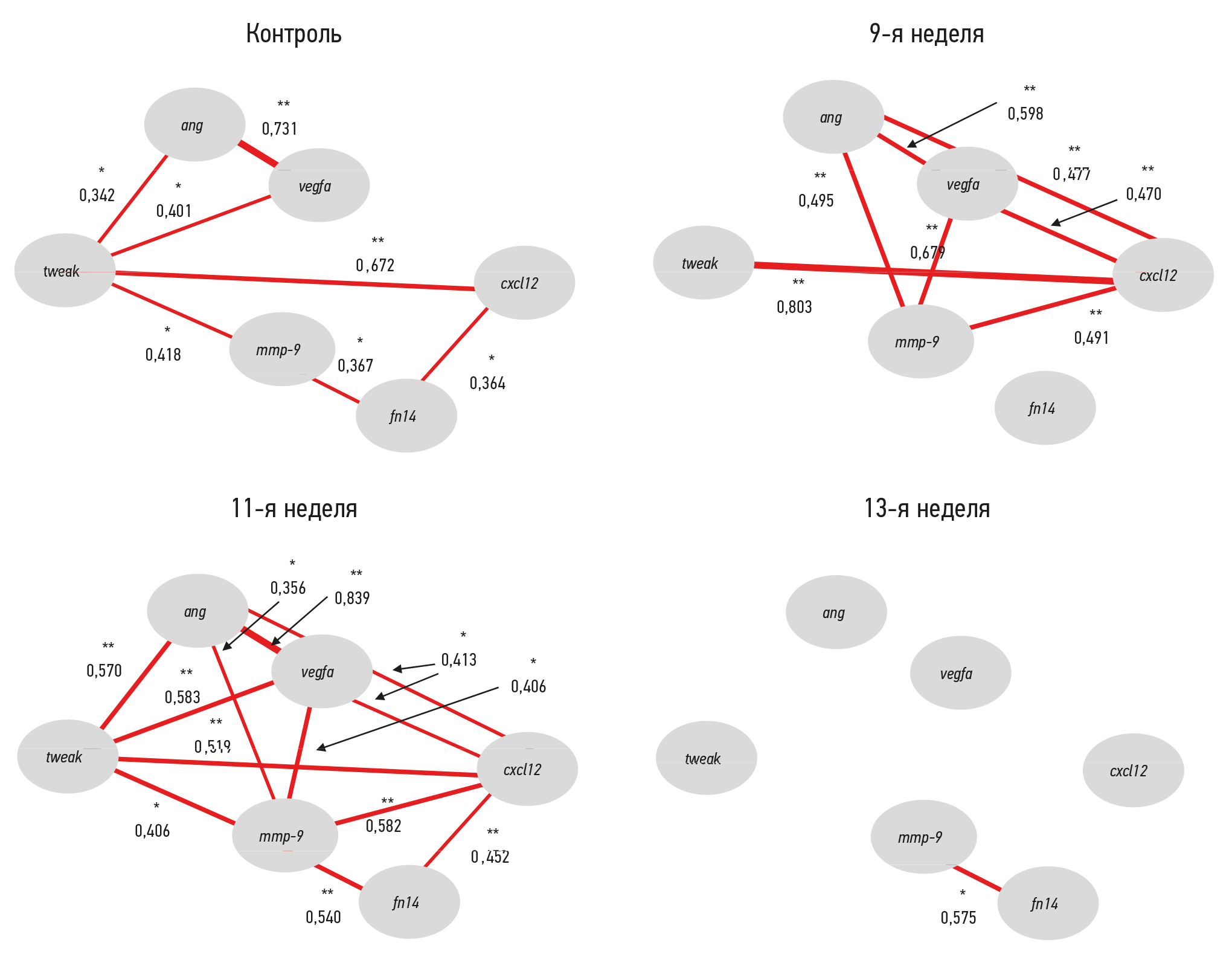 Уровень мРНК генов ang, cxcl12 и tweak (tnfsf12) — изначально пониженный по сравнению с контрольной группой (p <0,001 для всех) — также статистически значимо (р <0,001; p=0,013; p <0,001 соответственно) снизился к 11-й неделе эксперимента по сравнению с 9-й неделей. В отличие от них уровень мРНК fn14 (tnfrsf12) и mmp-9 изначально возрос по сравнению с контрольной точкой (p <0,001 для всех), однако по сравнению с 9-й неделей также снизился к 11-й неделе (p <0,001 и p=0,028 соответственно). Альтернативно отреагировал на события, развивающиеся на 11-й неделе эксперимента, ген vegfa. Аналогично ang, cxcl12 и tnfsf12 уровень его мРНК снизился к 9-й неделе по сравнению с контрольной группой, тем не менее к 11-й неделе он статистически незначимо возрос (порядка 10%).
