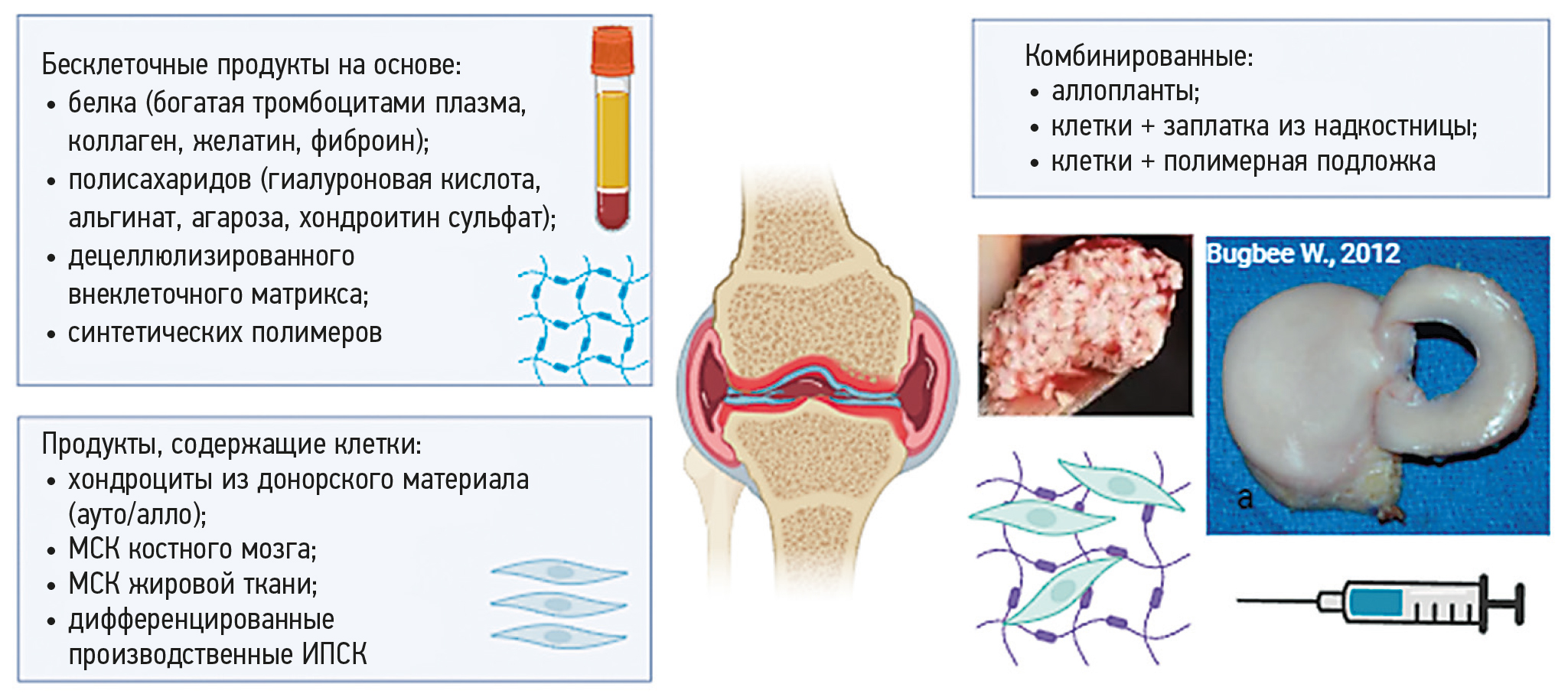 Рис. 1. Типы продуктов для терапии поражений хрящевой ткани. МСК — мезенхимальные стромальные клетки, ИПСК — индуцированные плюрипотентные клетки.