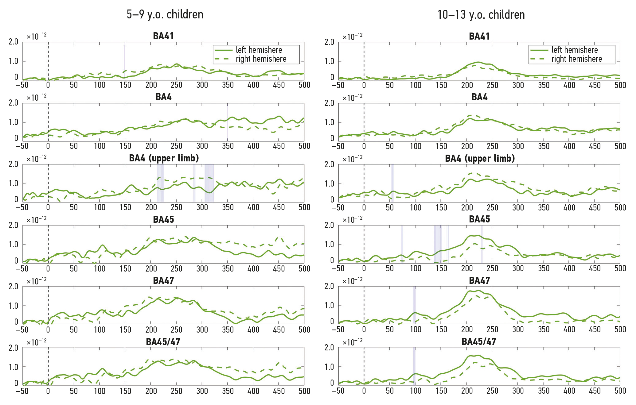 Finally, the analysis carried out for the pseudoword condition revealed left-lateralized responses in the younger group for all ROIs, except the motor areas (Fig. 3, left panel). The lateralization effects on the BA41 area were observed between 270 and 330 ms, whereas in inferior frontal areas, these effects occurred between 230 and 270 ms. By contrast, for older children, no significant lateralization differences were found in any of the selected ROIs within the MMNm response time window, except for a slightly right-lateralized late response component in the hand-motor area and a brief left-lateralized BA45 activation early on (Fig. 3, right panel).