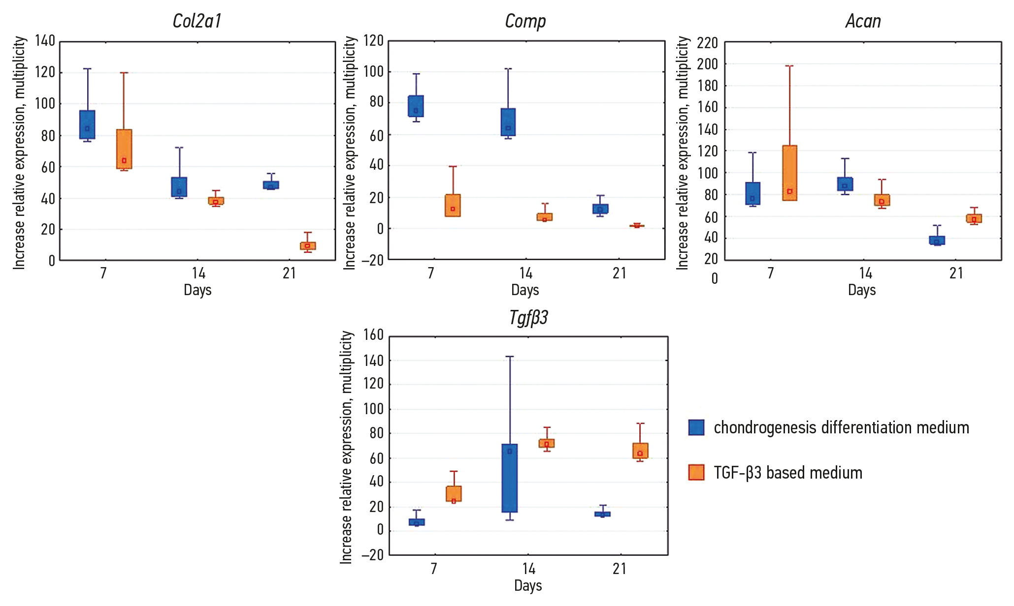 The TGF-β3 protein-based mixture was prepared promptly prior to each medium change. It comprised TGF-β3 growth factor at a concentration of 10–2 ng/µl (Sigma-Aldrich, USA), L-proline at a concentration of 50 µg/ml (Sigma, USA), dexamethasone at 10–4 mmol/µl (Sigma, USA), and L-ascorbic acid at 50 µg/ml (Sigma, USA). Cells were seeded in 48-well culture plates. After the third passage, the transition from standard nutrient medium to differentiation medium was implemented. Then, the medium was replaced every three days. The cultivation volume for each sample was 2 ml. Differentiation efficiency was monitored through gene expression on the 7th, 14th, and 21st days. The experiment was repeated a total of ten times in order to acquire statistically significant results.