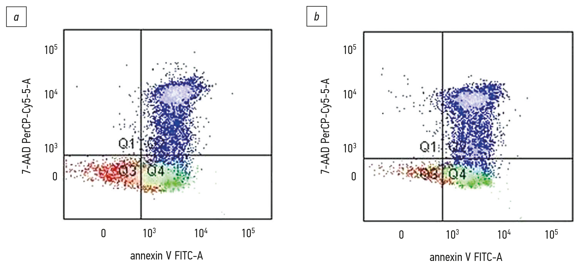 Рис. 1. Анализ dot plot распределения культивированных в течение 3 сут in vitro лимфоцитов крыс при окрашивании annexin V-FITC и 7-аминоактиномицином D (7-AAD): a — интактных, b — активированных форбол-миристат-ацетатом. Квадрант 1 — клетки в стадии некроза (annexin V–/7-AAD+); 2 — клетки в стадии позднего апоптоза (annexin V+/7-AAD+); 3 — живые клетки (annexin V–/7-AAD–); 4 — ранние апоптотические клетки (annexin V+/7-AAD–).
