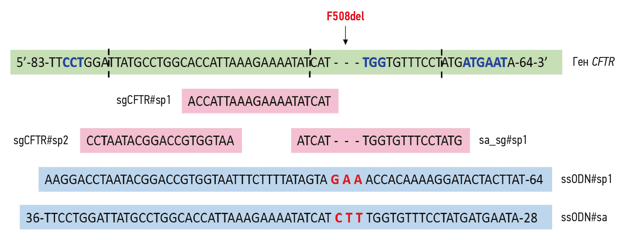 8. Fig. 4. Scheme of the localization of selected single guide RNAs (sgCFTR#sp1, sgCFTR#sp2, and sgCFTR#sa, highlighted in pink) and single-stranded oligodeoxyribonucleotide (ssODN#sp1 и ssODN#sa, highlighted in blue; the missing three nucleotides that will be added to the genome by single-stranded oligodeoxyribonucleotide during homologous reparation are shown in red letters) in the CFTR locus (highlighted in green; PAM sequences for single guide RNAs are shown in blue letters). The arrow indicates the position of the F508del mutation to be corrected.