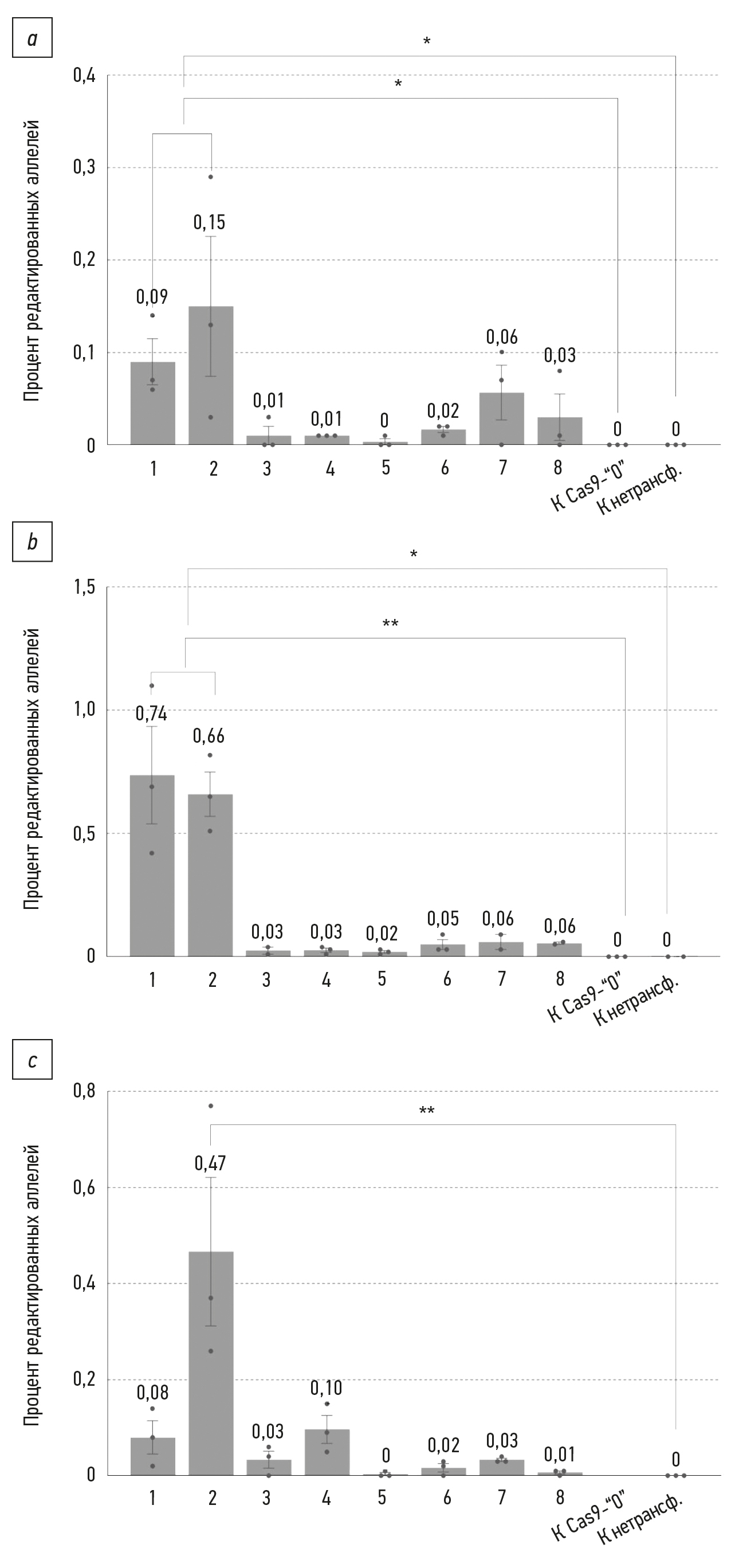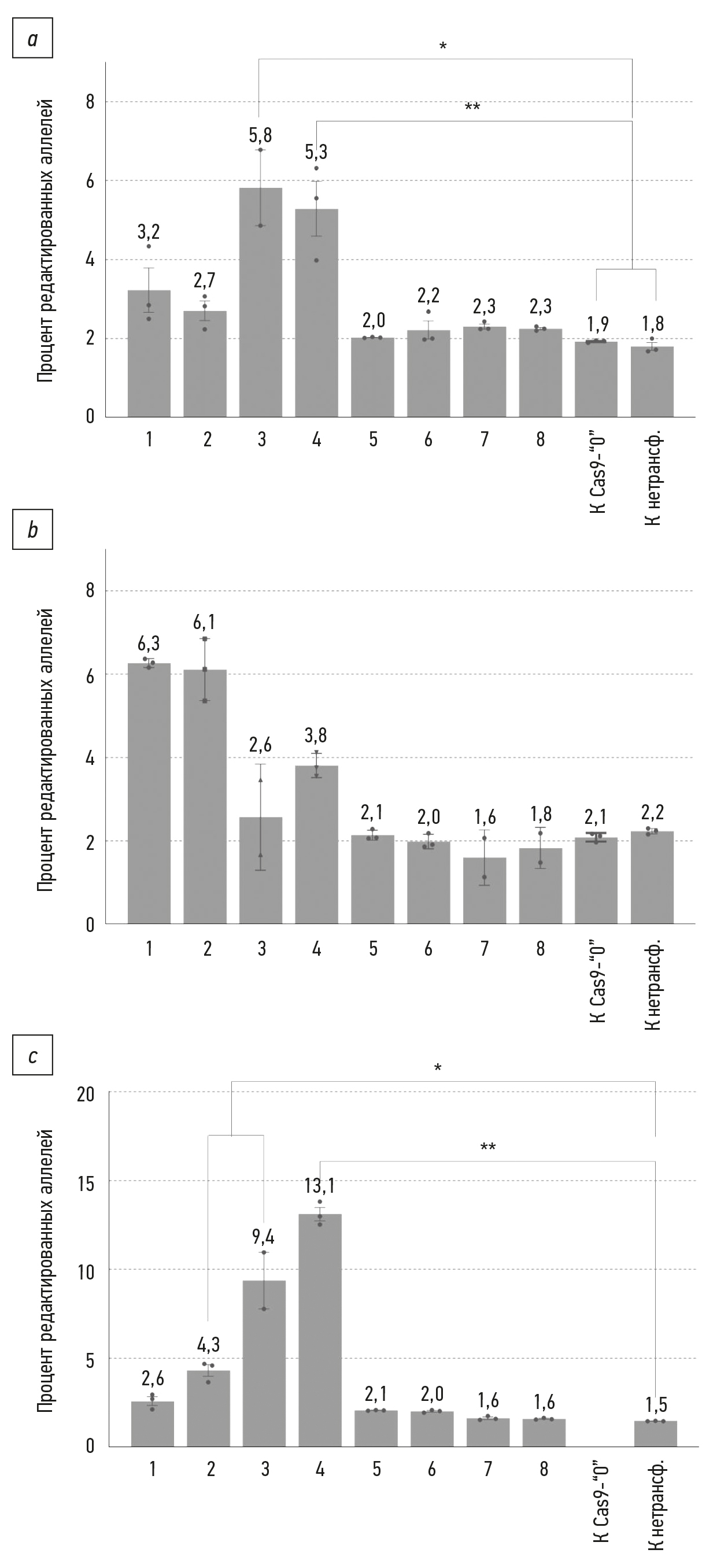 12. Fig. 8. Non-homologous end joining levels in three human induced airway basal stem cells lines: a — P1L5 line, b — P2L2 line, c — P7L2 line. The numbers on the Y-axis correspond to the numbers of the editing systems in Table 3. “К нетрансф.” means the untransfected control. Mean ± SEM (n=3–6); * p <0.05; ** p <0.01.