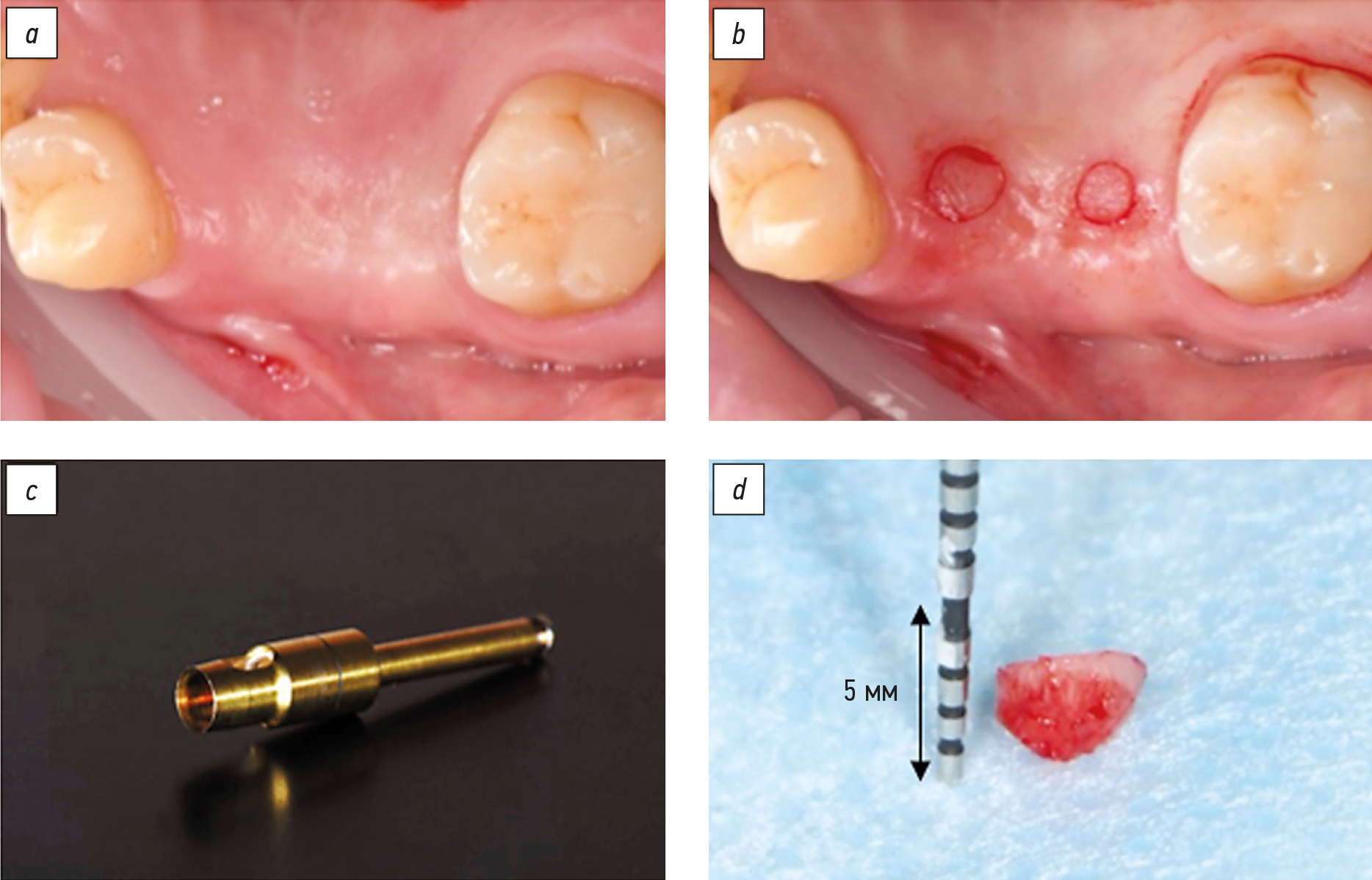 Fig. 1. Soft tissue biopsy for histology: a, preoperative gingiva; b, gingival excision; c, surgical mucotome; d, obtained material.