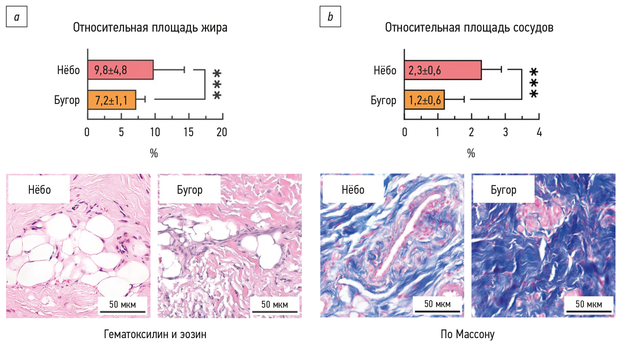 Рис. 2. Результаты морфометрии соединительнотканных трансплантатов десны из области нёба и бугра: а — гистограмма относительной площади жира в препаратах десны из области нёба и бугра, и пример срезов, окрашенных гематоксилином и эозином; b — гистограмма относительной площади сосудов в препаратах десны из области нёба и бугра, и пример срезов, окрашенных по Массону; с — гистограмма количества фибробластов в препаратах десны из области нёба и бугра, и пример срезов, окрашенных по Массону; d — гистограмма относительной площади коллагена в препаратах десны из области нёба и бугра, и пример срезов, окрашенных по Ван Гизону; * p <0,05; *** p <0,0001. «Нёбо» — срез биоптата из области нёба, «Бугор» — срез биоптата из области бугра.
